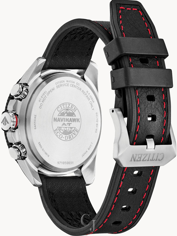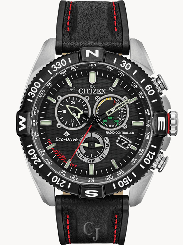 Soar to new heights with the modernized CITIZEN Promaster Navihawk timepiece. A chronograph with all the tools for professional use, featuring world time in 24 cities, radio control, tachymeter, perpetual calendar, alarm and power reserve indicator. Showcased here in a stainless steel case, rich black leather strap with contrast red stitching, black dial and red accents. Featuring our Eco-Drive technology – powered by light, any light. Never needs a battery. Caliber number E660.