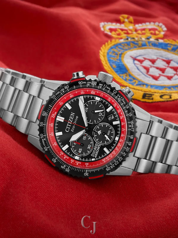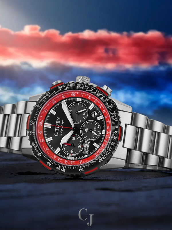 On the wrist, the watch’s silver-tone stainless steel case measures 40mm in diameter, wearing boldly with its sharp faceting and satin finishing, while a slide-rule scale on the bidirectional black and red ion-plated bezel provides additional flight utility. A triple-link stainless steel bracelet secures the timepiece. On the dial, a Red Arrows colorway with white accents adds to the watch’s superior legibility, while a sapphire crystal and 200m of water resistance protect it all. Functions include a 1/5 second chronograph measuring up to 60 minutes, 12/24 hour time displays, and a date indicator. The movement is protected via a Red Arrows’ insignia-signed case back, and is powered by our proprietary Eco-Drive technology – sustainably powered by light and never needing a battery. Caliber B620.