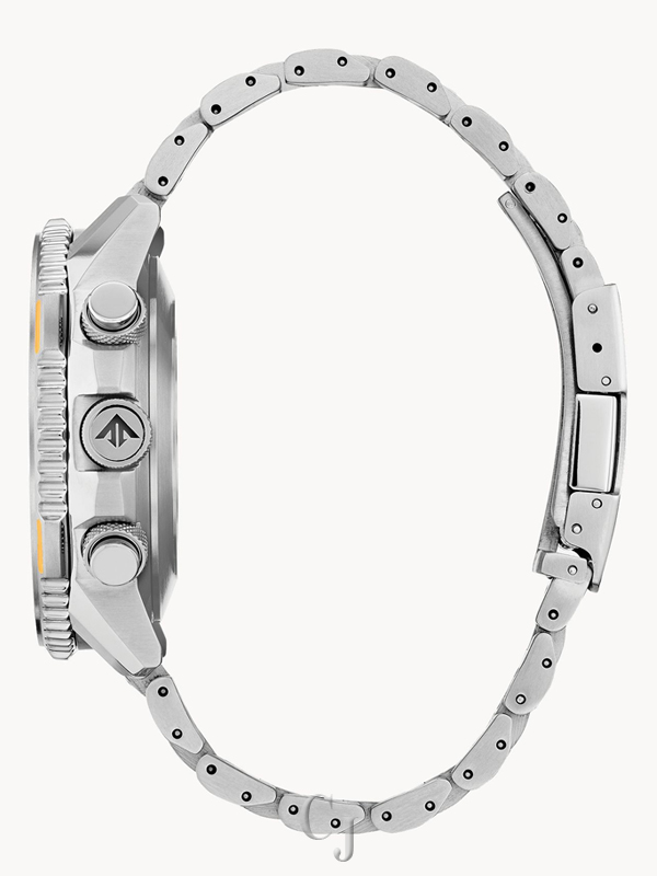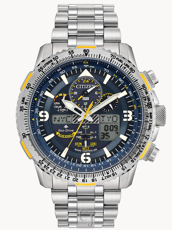The Blue Angels are the Navy’s elite flight demonstration squadron renowned for their precision and grace showcased in each of their flight maneuvers. This precision and grace is exhibited in the CITIZEN Promaster Blue Angels Skyhawk A-T with precise atomic timekeeping in 43 cities. Other features include a chronograph, perpetual calendar, dual time, alarms, countdown timer, digital backlight and UTC display, power reserve and pilot’s rotating slide rule bezel. This model appears in a Super Titaniumâ„¢ case and bracelet, yellow accented dark blue dial with the Blue Angel’s insignia replicated on the caseback. Featuring our Eco-Drive technology – powered by light, any light. Never needs a battery. Caliber number U680.