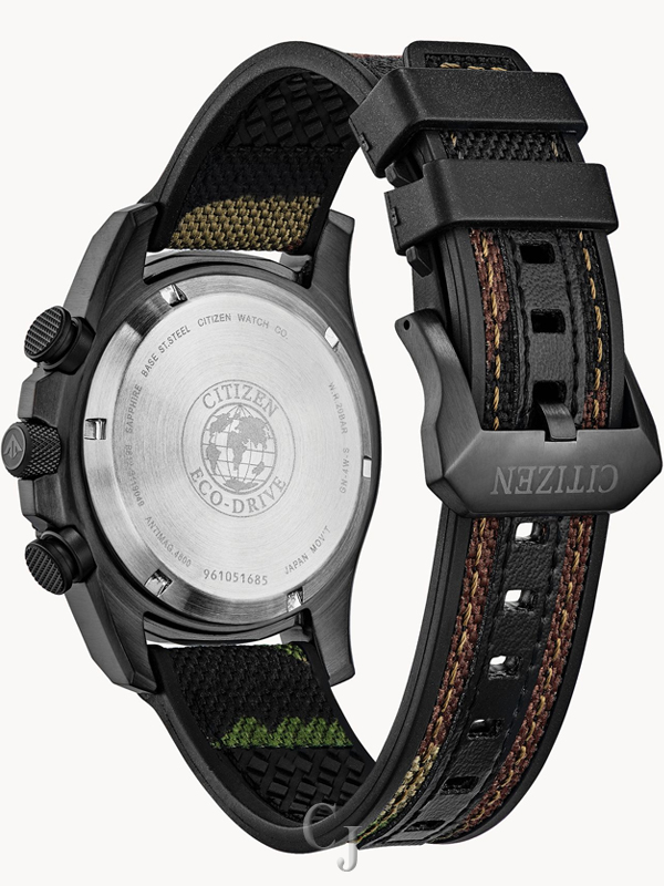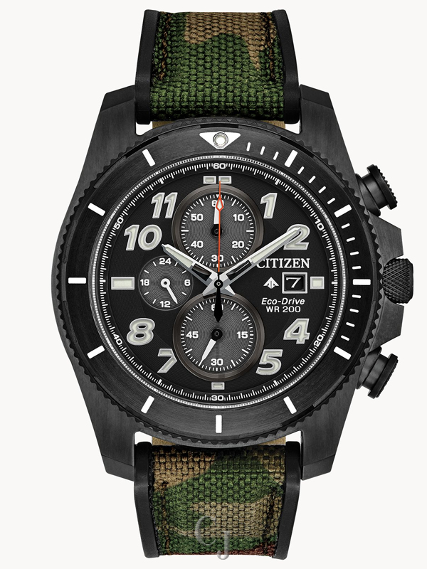 Test the extremes with the CITIZEN Promaster Tough series, now featuring chronograph and 12/24-hour time. Living up to its name, this timepiece features shock resistance and anti-magnetism. A black ion-plated stainless steel case with CITIZEN’s proprietary Duratect surface hardening coating, allowing for anti-rust, scratch resistance, hypo-allergenic and 5X harder than stainless steel. Other features include camo patterned ballistic nylon and polyurethane strap, black dial, anti-reflective sapphire crystal, super LumiNova hands and markers and ability to function in extreme temperatures. Featuring our Eco-Drive technology – powered by light, any light. Never needs a battery. Caliber number B612. * LumiNova® is a registered trademark of NEMOTO & CO.,LTD.