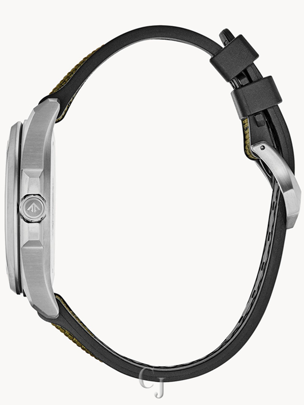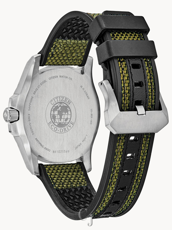 Test the extremes with the brand new CITIZEN Promaster Tough series. Living up to its name, this timepiece features a monocoque case (2 piece construction resulting in no caseback) resulting in extreme rigidity, shock resistance and anti-magnetism. Super Titanium™ coating on a stainless steel case allowing for anti-rust, scratch resistance, hypo-allergenic and 5X harder than stainless steel. Other features include military green Cordura® ballistic fabric strap, anti-reflective sapphire crystal, super LumiNova hands and markers and ability to function in extreme temperatures. Featuring our Eco-Drive technology – powered by light, any light. Never needs a battery. Caliber number E168. * LumiNova® is a registered trademark of NEMOTO & CO.,LTD.