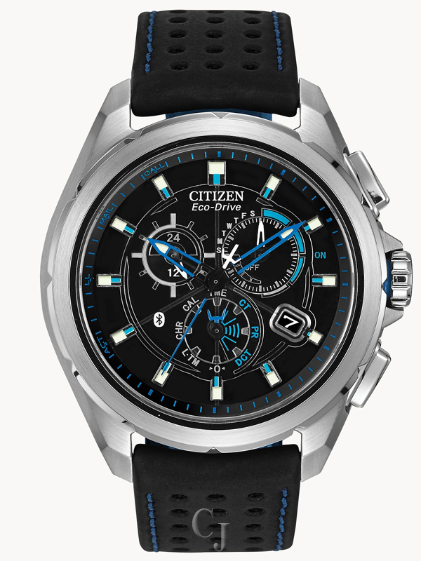 Both smart and good looking, the Citizen Proximity, features perpetual calendar chronograph with second time zone, 12/24 hour time, power reserve and sporty leather strap with a nylon backing. This timepiece is Bluetooth 4.0 compatible and just like the watch this low energy Bluetooth is powered by Eco-Drive technology. Through the Bluetooth 4.0 connection with your iPhone®, you can be alerted to incoming calls, emails, messages, reminders, and alerts. The free of charge Proximity App is available from the Apple® App Store on your compatible iPhone® or from iTunes on your computer.