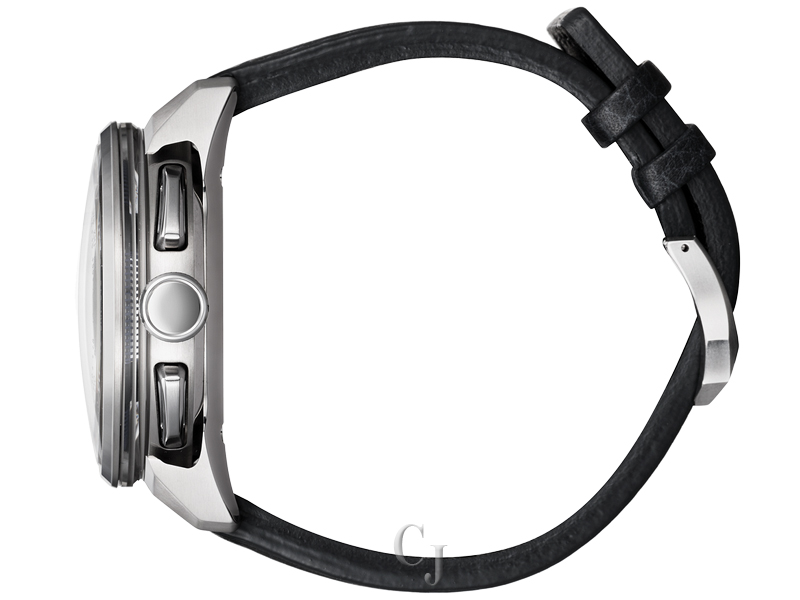 indicator, and dual time round out the advanced capabilities of this elegant watch. The blue dial is set in a titanium case, with black hands and a blue leather strap to complete the stylish yet functional look.