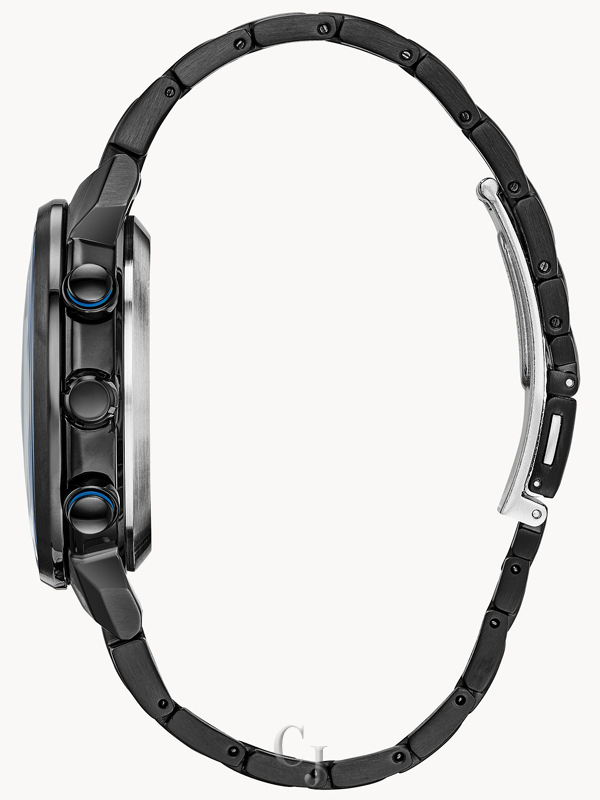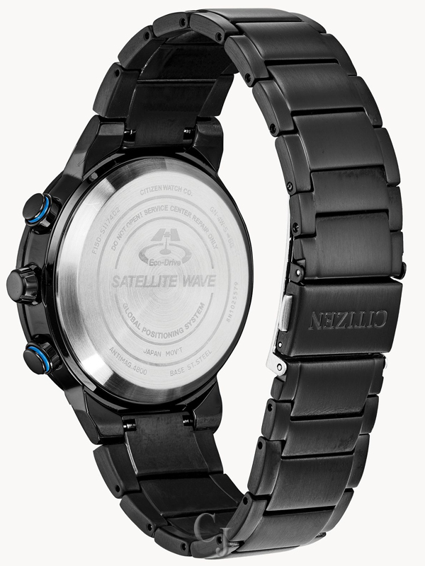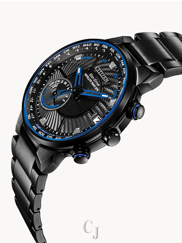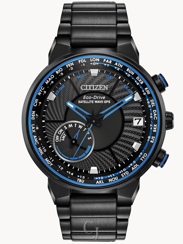 Bolder and brighter. Enhanced technical and architectural design; the new Citizen Satellite Wave GPS Freedom is the leader of the pack with the world’s fastest timekeeping signal reception speed from GPS navigation. A sleek black ion-plated stainless steel case and bracelet, black dial and brilliant blue accents featured satellite GPS timekeeping technology with worldwide reception and time adjustment in 40 time zones. Powered by Eco-Drive technology – powered by light, any light. Never needs a battery. Caliber number F150.