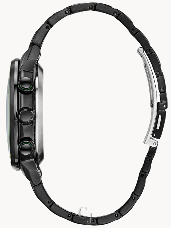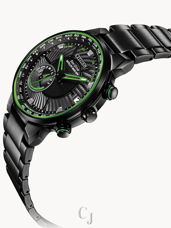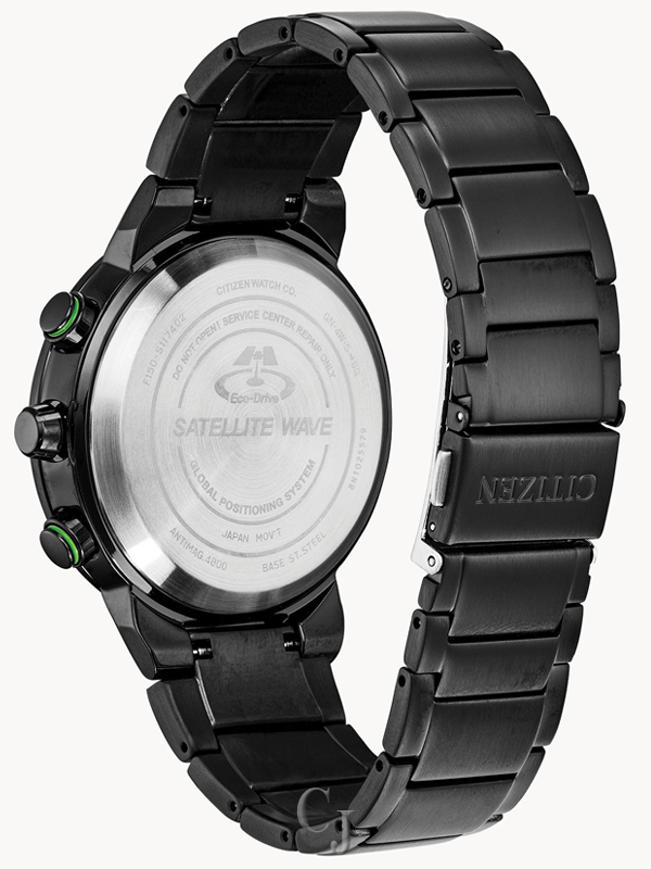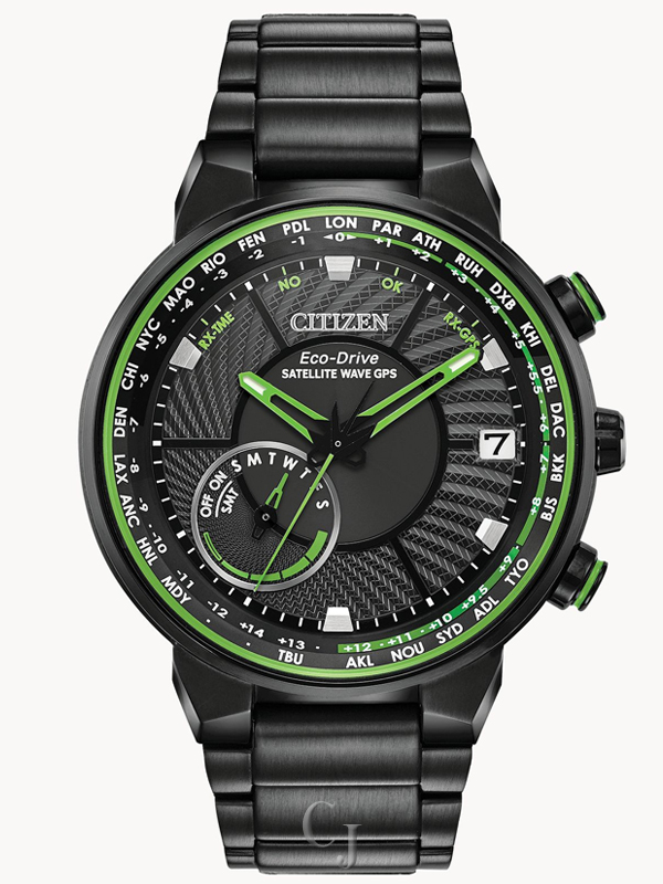 Bolder and brighter. Enhanced technical and architectural design; the new Citizen Satellite Wave GPS Freedom is the leader of the pack with the world’s fastest timekeeping signal reception speed from GPS navigation. A sleek black ion-plated stainless steel case and bracelet, black dial and brilliant green accents featured satellite GPS timekeeping technology with worldwide reception and time adjustment in 40 time zones. Powered by Eco-Drive technology – powered by light, any light. Never needs a battery. Caliber number F150.