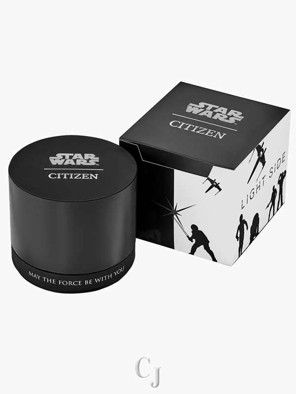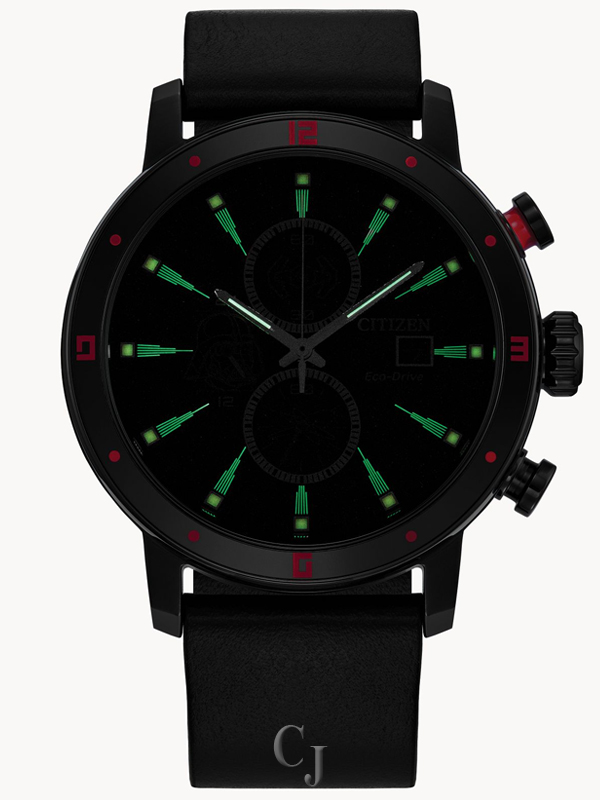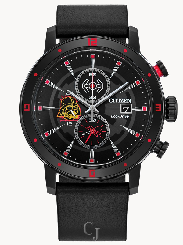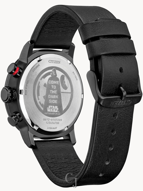 Join the dark side with the Star Wars™ Darth Vader™ timepiece from Citizen. The 44mm chronograph is bold in a black IP case, channeling the dark dominance of the Sith Lord with red detailing throughout and a unique case back reading, “Come to the Dark Side.” The chronograph functionality is able to measure ⅕ second up to 60 minutes. An illustration of Darth Vader’s helmet, a TIE fighter, and details from a starfighter’s screen decorate the display’s sub-dials, while along the periphery of the dial luminous crimson hour markers harken to the Sith’s iconic red lightsaber. The watch is sustainably powered by Citizen’s proprietary Eco-Drive technology, so it’ll never need a battery. Caliber number B612.