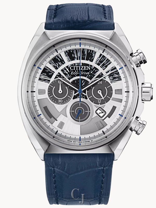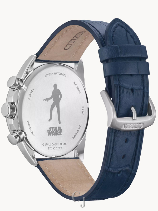 With every detail, the Star Wars™ Millennium Falcon timepiece from CITIZEN is a tribute to the iconic starship. Its stainless steel case encompasses a recreation of the cockpit against a silver-tone dial. The cockpit windows illustrate hyperdrive, complete with a luminous print. Bright navy blue hands and a crocodile-embossed leather strap lend color to the chronograph, which also features 12/24-hour time and date. Han Solo’s silhouette is etched on the case back. Powered by Eco-Drive technology, this Star Wars watch never needs a battery.
