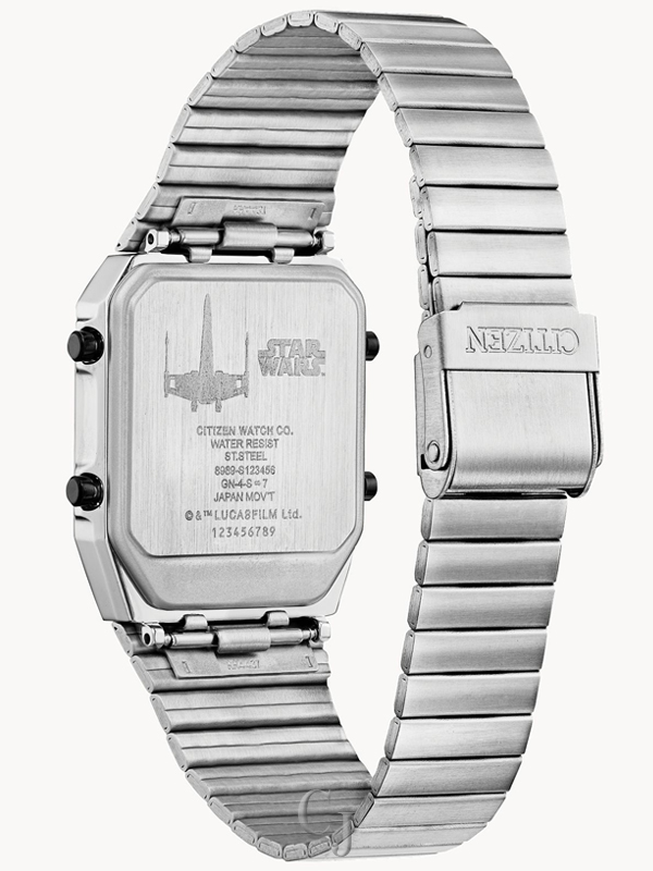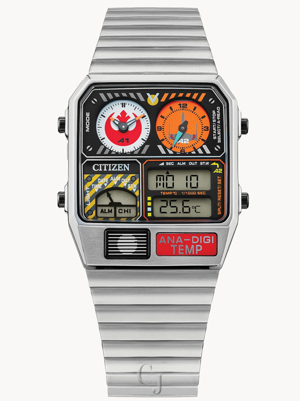 May the Force be with you, with this Rebel Pilot inspired watch from Citizen celebrating the Star Wars™ galaxy. Inspired by an original Citizen analog-digital watch from the 1980s, this stainless steel rectangular case watch is packed with features, including dual time and subdials with both the Rebel Alliance logo and the X-Wing with Rebel inspired colors. It also includes an alarm, the digital time, and the temperature, making it a unique and stand-out timepiece. This watch requires a battery. Whether you are a long-time fan who still believes the original trilogy can never be topped, or you’re just being introduced to this galaxy far, far away, this is a Star Wars watch every collector will want to show off.