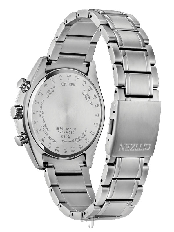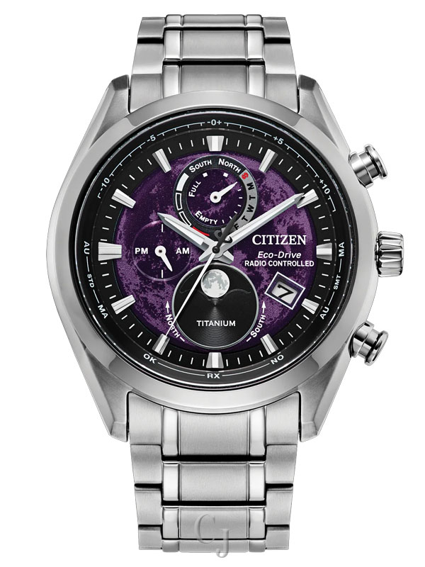 When breakthrough technology and spectacular design meet, the Tsuki-yomi A-T is reading the moon. It’s the world’s first moonphase watch combined with atomic timekeeping innovation from Citizen, and this model is nothing short of impressive. The styling embodies the moon’s surface and a window at 6 o’clock displays the current moon phase. The timepiece measures 43mm in a silver-tone Super Titanium™ case, where sharp faceted edges pair with an elevated design throughout for an eye-catching aesthetic on the wrist. The deep purple dial works in tandem with black accents and silver-tone touches for a display that’s as handsome as it is legible. In addition to its running time, the watch features a moon phase display, world time in 24 time zones, a perpetual calendar, and a day-date functionality. Powered by Citizen’s proprietary Eco-Drive technology to provide light-powered vitality without ever needing a battery. Water resistant up to 100 meters. Caliber H874.