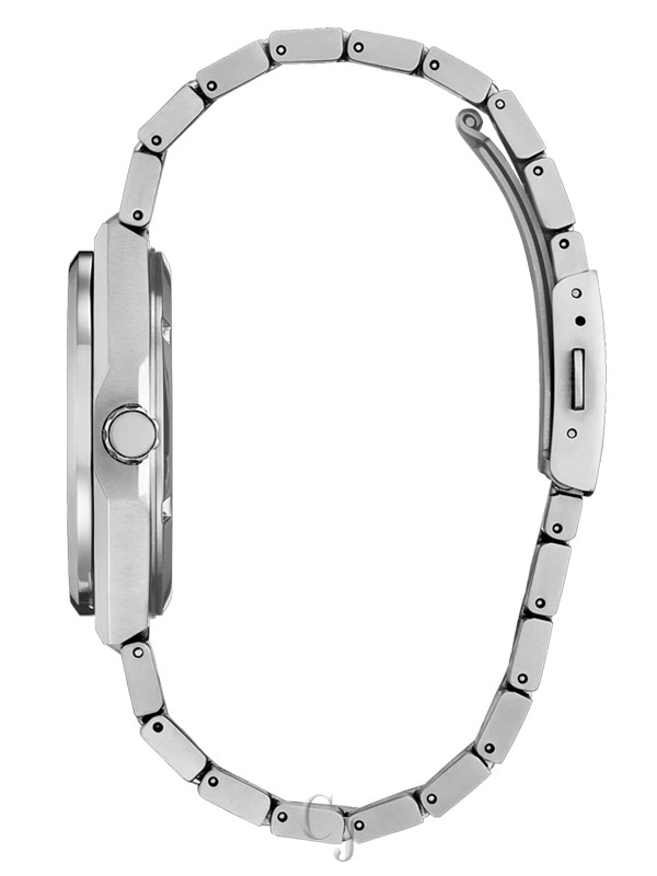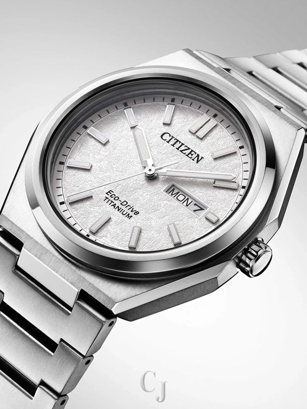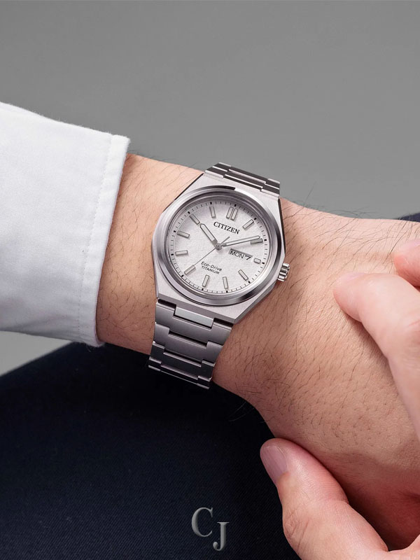 Pairing classic proportions and innovative technology with a distinctly modern style, we present our new Zenshin collection. Made with our proprietary material, Super Titanium™, which is five times harder and 40% lighter than stainless steel and is scratch- and rust-resistant, this sporty timepiece features a 39mm silver-tone Super Titanium™ case that is elevated with finely brushed and polished finishing while being secured to the wrist with an integrated matching bracelet. On the dial, a textured white color is accented with an outer minute ring in black, with silver-tone details and luminous hands and markers. A combined day-date window at the 3 o’clock position adds daily utility and hints at the watch’s retro-style inspirations. Sustainably powered by any light with Eco-Drive technology and never needing a battery, this versatile watch is also water resistant to 100 meters. Caliber J800.