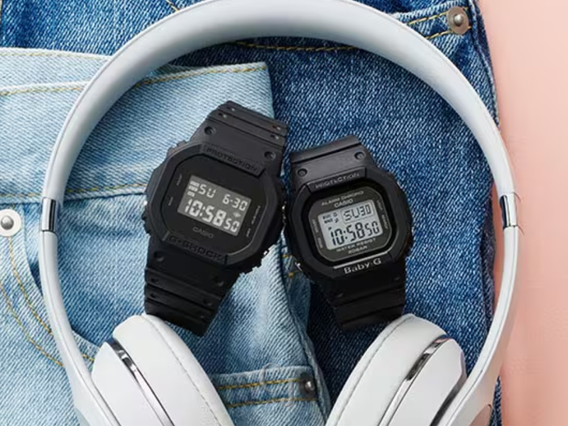 This is a black-and-white themed “Solid Colors” G-Shock model in black. This watch is entirely black, and its plain texture is emphasized by the single-tone color. The matte color on the body and band of the watch not only allows for a simple color scheme, but also emphasizes the shape of the watch itself. With its distinctive solid design, this model can be worn as a fashion statement.