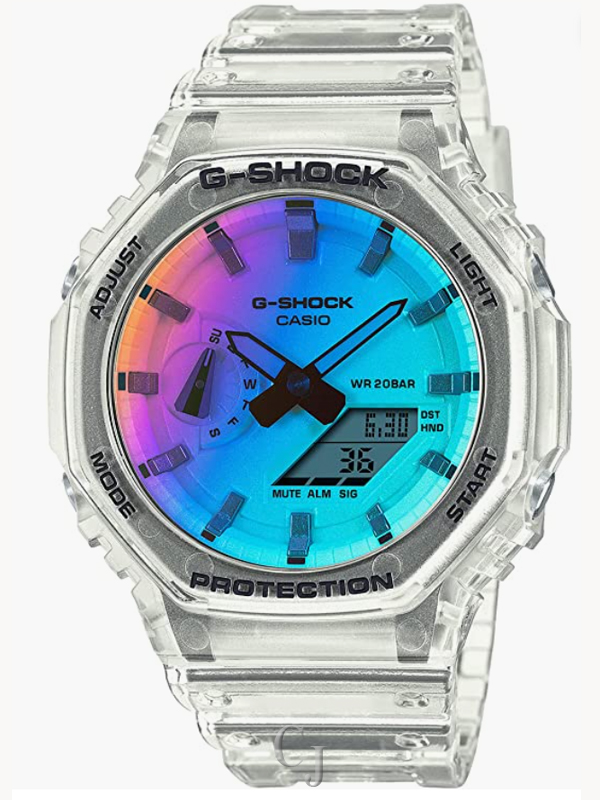 Immerse yourself in brilliant iridescent color, the first-ever G-SHOCK with full-surface gradated crystal finish evoking reflected sunlight. Rainbow vapor deposition reproduces the midsummer sky at dusk, changing hue moment by moment depending on the light. Each crystal gleams with a singular radiance, delivering one-of-a-kind timepieces, each with its own unique color pattern.