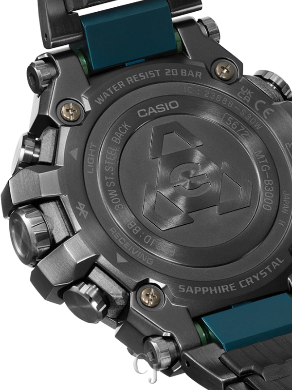 With its even more advanced Dual Core Guard structure, the MTGB3000 protects the module in a carbon-reinforced resin case and encloses the exterior in metal components. Repeated pressing, cutting, and polishing builds the stainless steel case back upward into an intricate 3D form. The case back also serves as the lugs to secure the band and as the guards for crown and buttons, for a completely new structure. Using high-density mounting technology, we developed a new slimmer, multi-function module. All of these innovative designs and technologies created a much thinner watch, measuring just 12.1 mm from bezel to case back.Â