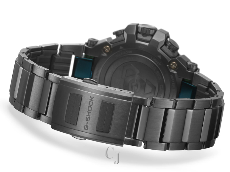 MT-G innovation extends even to the band. All-new one-touch exchange structure eliminates the need for special tools. Simply press buttons located on both sides of the lugs to quickly and easily swap out the band.