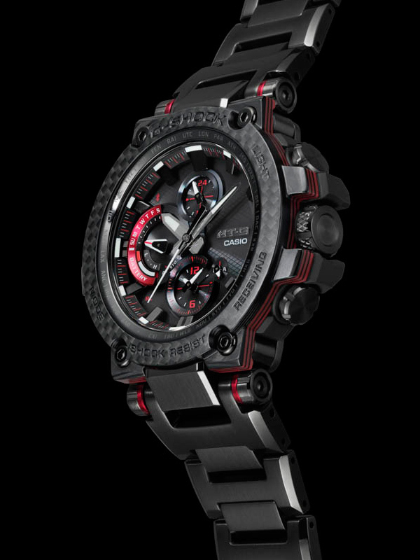 considered the “third material” after metal and plastics, for an evolution in design in keeping with the 20th anniversary of the MT-G series.Carbon fiber is similar to plastic in terms of its light weight, yet comparable to or exceeding metal in durability, although its hardness makes it more difficult to process. The red-accented MTG-B1000XBD comes with a layered composite band made with durable fine resin parts.