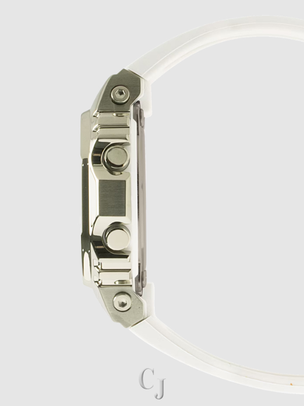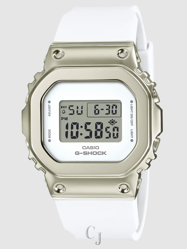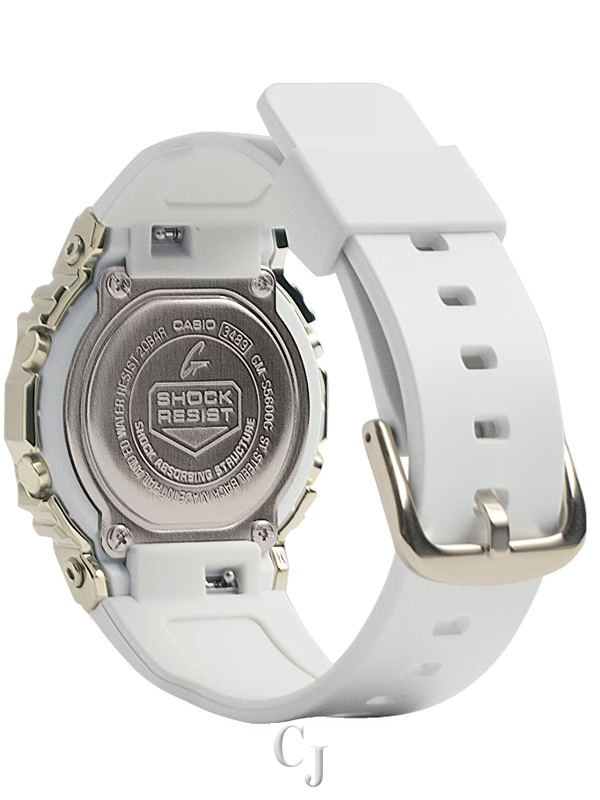 The bezel cover is made of metal with subdued gold ion plating, and the band is an elegant G-SHOCK band in white.