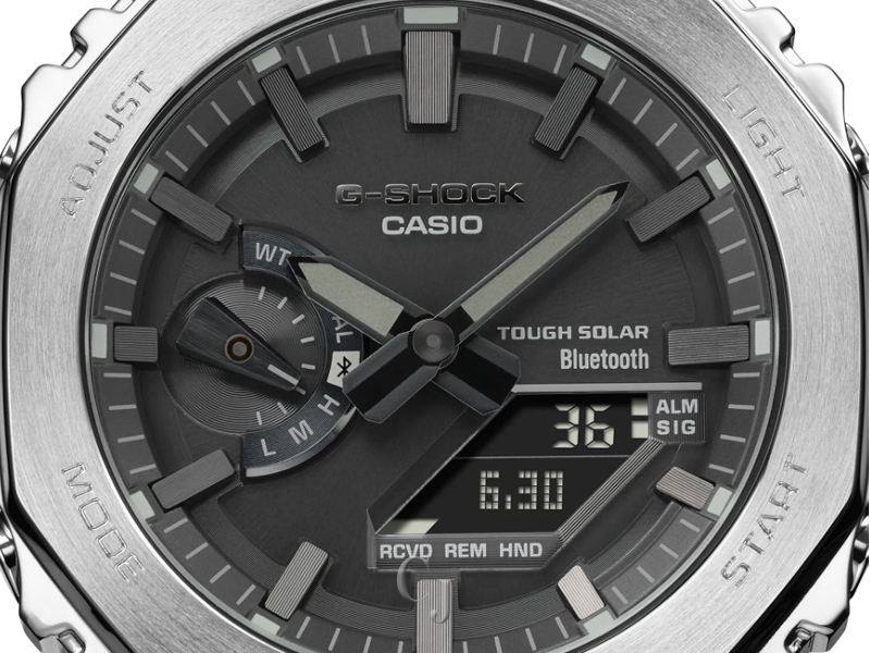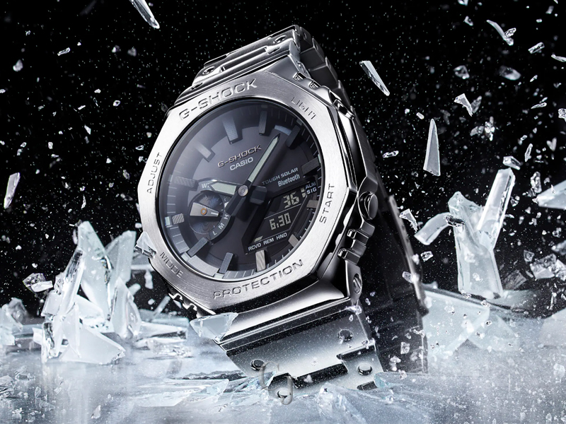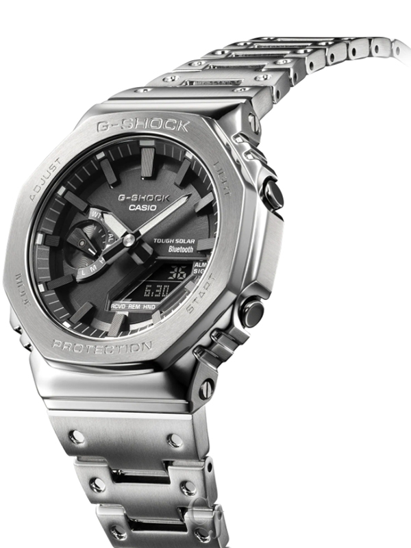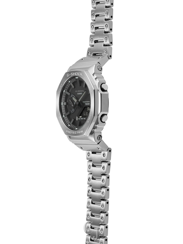 Luxe full-metal construction with a screw-back case, bezel, and band crafted in stainless steel creates a streamlined, minimalist design, while protecting the module from impact when dropped. We take it way back with the octagonal bezel and dimpled band design of the original from 1983, all done in metal.