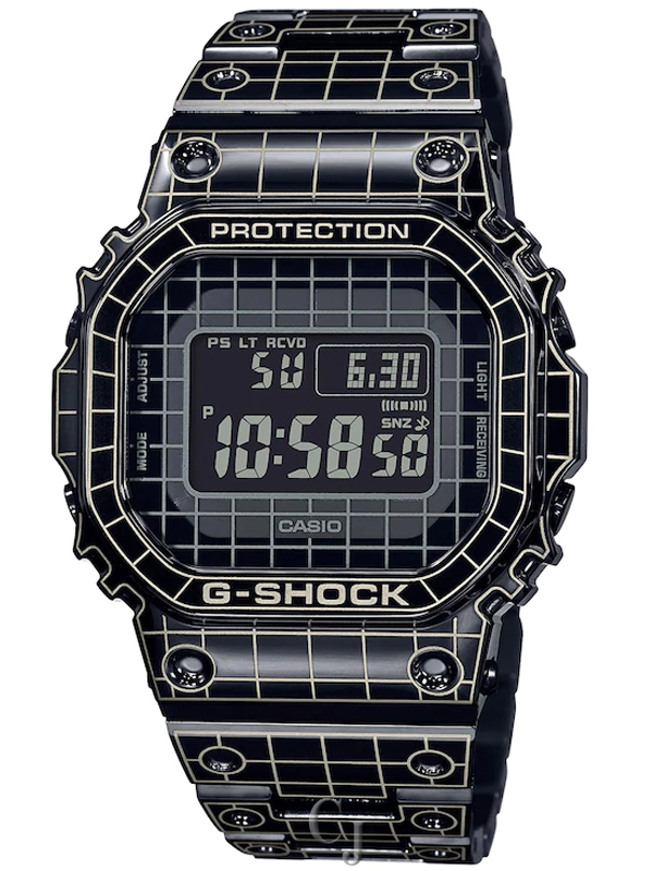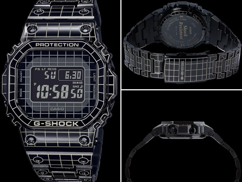 This laser-engraved model is a new variation on the full-metal square-face GMWB5000 that inherits plenty of the DNA of the original G-SHOCK DW5000C. The surface of the stainless steel case and band of the base model GMWB5000D is given a black IP finish, which is then laser etched to create an innovative Grid Tunnel pattern. The Grid Tunnel finish of this model adds a new modern touch to the timeless, classical design of the 5000 Series G-SHOCK