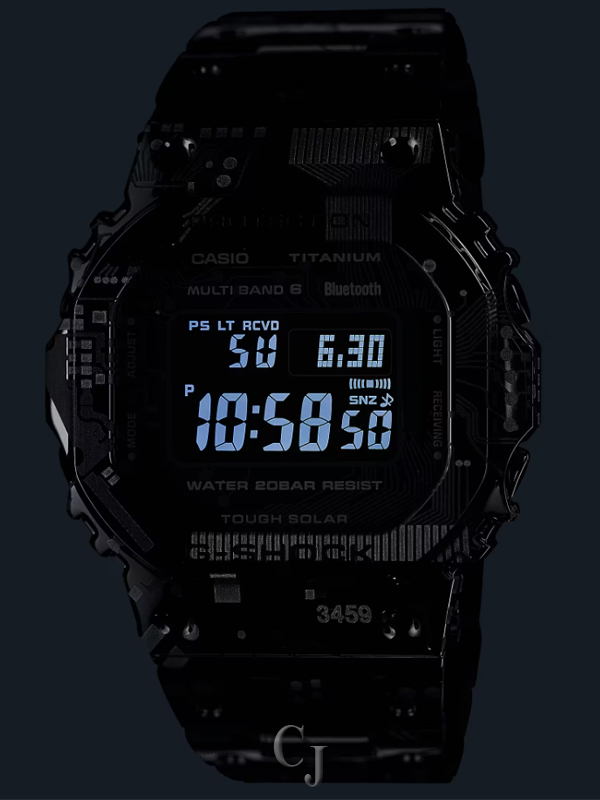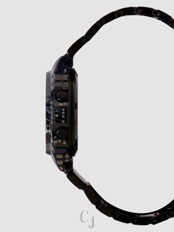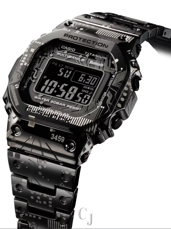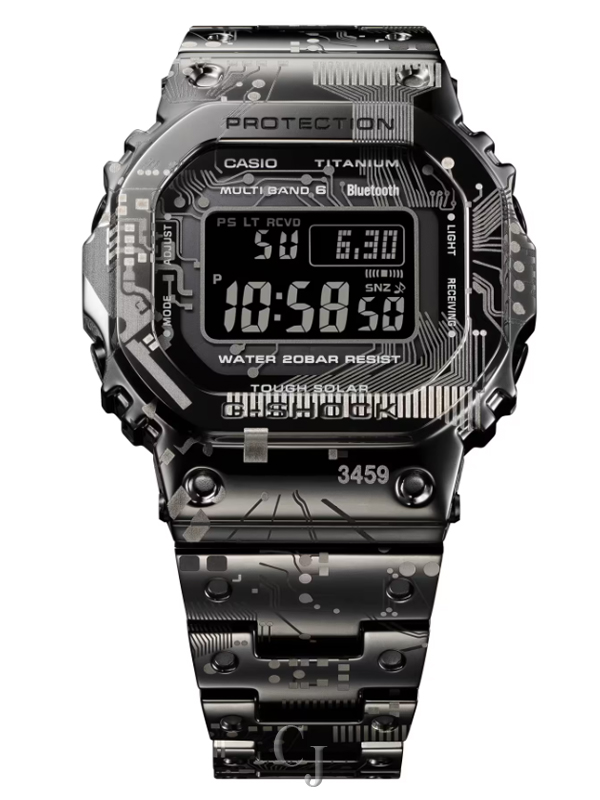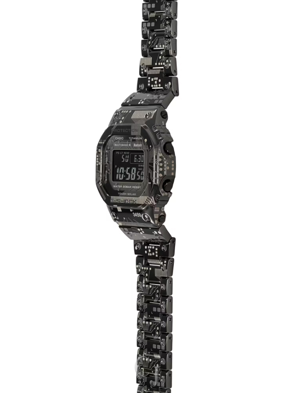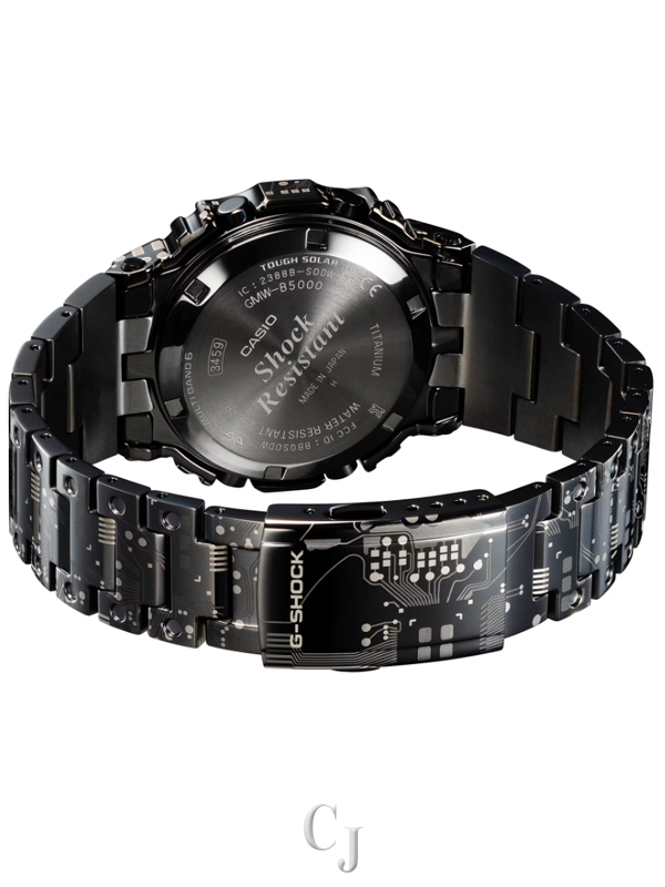 This unique design features a unique camouflage pattern abstracted from the circuitry of the no. 3459 module of the GMWB5000. The pattern is rendered in black ion plating and laser engraving, which is applied both before and after the ion plating to create the impression of shading for a pattern of depth and dimension.
