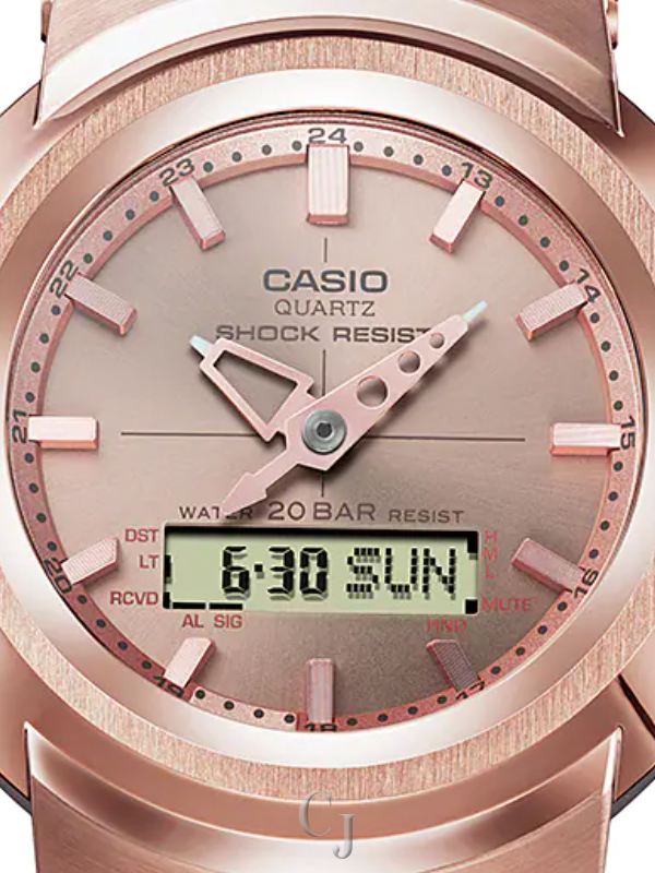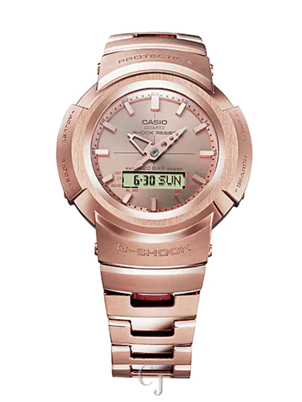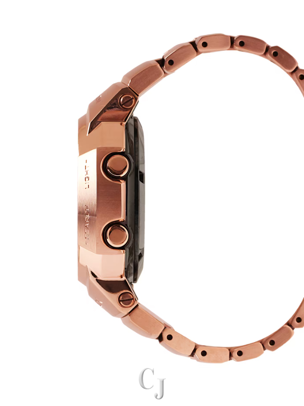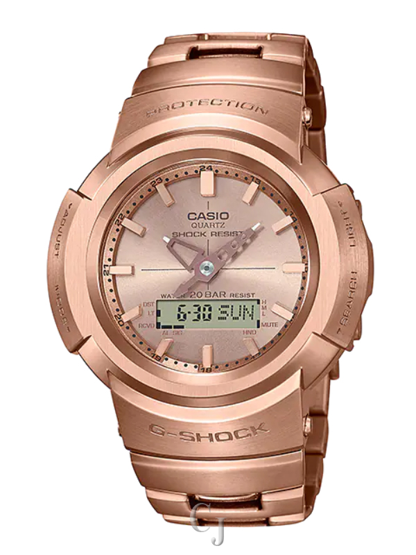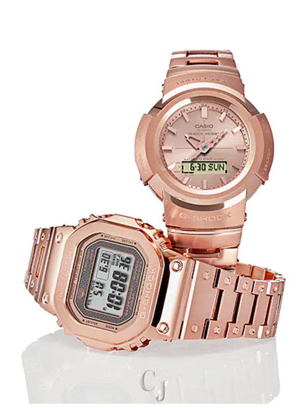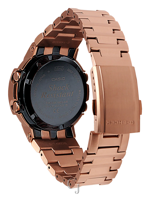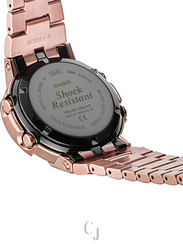 This is an AWM-500 Series of full-metal models of G-Shock’s first analog-digital watches. Based on the AW-500 model that was released in 1989—the first-generation analog-digital combination G-Shock watch—these models use hardy stainless steel on their bezels and bands. Rose gold ion plating has been applied to the entire model. The band was developed specifically for the AWM-500 and manages to recreate the smooth shape of the AW-500 by using a curved design that melds into the case. The back of the watch features Screw Lock Back. A mirror and hairline finish has been applied to each surface of the bezel, and the use of 3D indices and vapor deposition treatment on the dial enhances the feel of the watch. The time is automatically corrected within Multi-Band 6 areas. Additionally, Tough Solar technology provides a stable source of power and the watch is packed with functional features such as high-luminance Full Auto LED illumination and World Time.