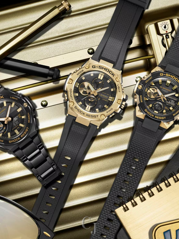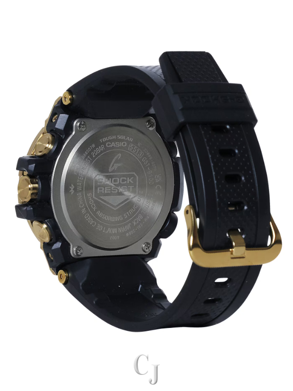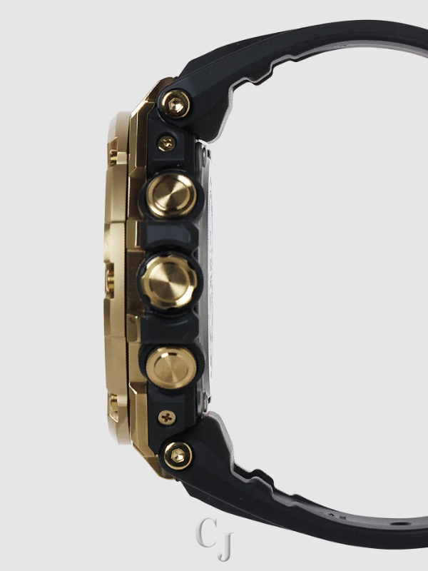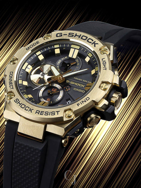 The Casio GSTB100GB1A9 from the G-SHOCK G-STEEL Series is a top–of–the–line black and gold watch. The gold color theme offers a dual aesthetic, perfect for both casual and formal occasions. The lightweight luxury fitness watch is built with metal and resin components that accentuate the contrasting colors and materials. The construction features a metal bezel that has been ion-plated in gold, contrasting against a sleek black base.