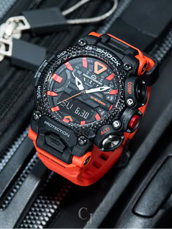 This is a Quad Sensor-equipped model in the G-Shock Gravitymaster Series, designed for pilots working in harsh conditions. Its structure combines a carbon fiber-reinforced resin case with a Carbon Core Guard that protects the module, offering shock resistance and fortifying the watch against vibrations. The resin that forms the bezel area has a three-layer Carbon Fiber Insert structure, making it wear-resistant. The three buttons at 3 o’clock have been designed to resemble a helicopter control stick, while also achieving ease of use. An iconic orange has been used on the dial and band to symbolize the strength and spirit of air rescue teams. Function-wise, this model comes equipped with a Quad Sensor featuring compass, altimeter/barometer, temperature reader and pedometer. It also offers time correction by linking to the dedicated G-Shock app, and the Mission Log feature allows the various data obtained by the watch to be recorded in the app. You can also use the app to set modes on/off and customize settings, including switching between displays. This is a Gravitymaster model that embodies the mobility of a helicopter along with all the functions and toughness essential for flight missions.