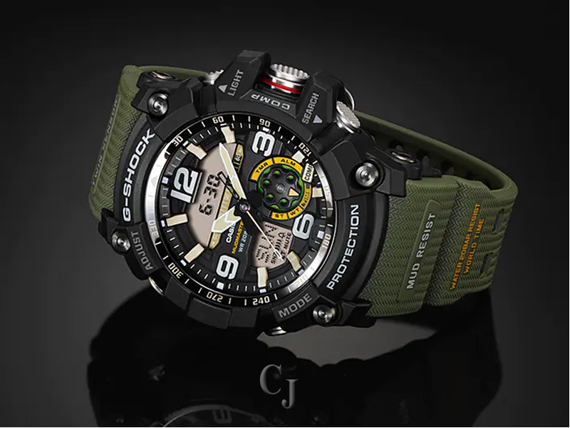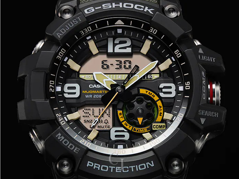 This is a Twin Sensor model from the G-Shock Mudmaster Series, designed for use in extreme environments scattered with rubble, dirt and debris. With a push of one large button at the 3 o’clock position, you can check your position with its Compass. The temperature can also be measured easily by pushing the button at 4 o’clock. This model has been developed with operability in mind so that anyone can intuitively check their position using the Compass, even in the most extreme climates, without visual observation. The dust and mud-resistant button guard cylinder structure prevents fine sand and mud from getting into the buttons while also helping to absorb any shock to the buttons and improving operability. Broad hour/minute hands and indices of large Arabic numerals have also been adopted to improve visibility. This design is packed with military-style flare, including a mode display that uses a sprocket-inspired disk dial and a textured band to prevent slipping.