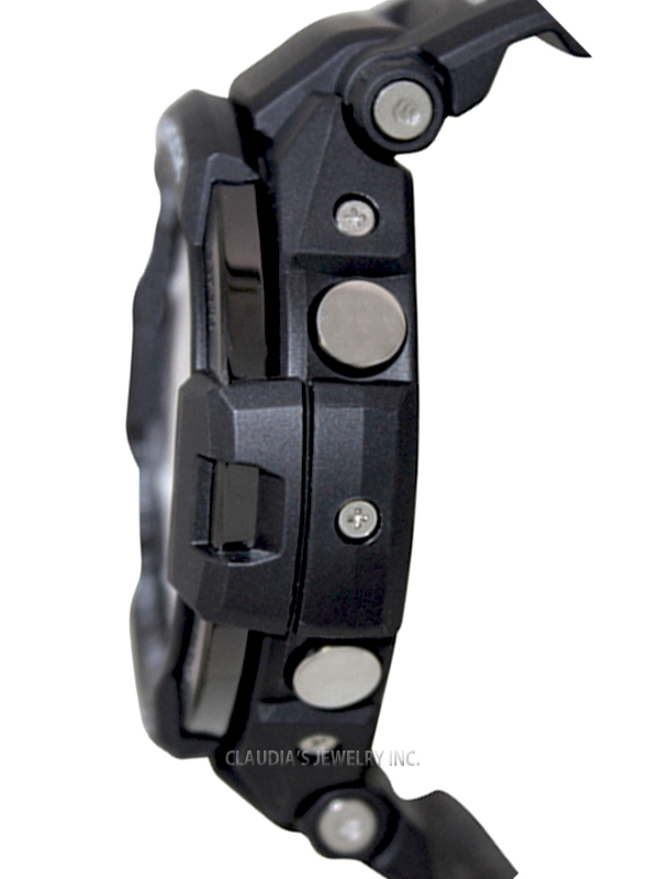 This new model is the first in the G-Aviation lineup to be equipped with Twin Sensor capabilities, creating a watch that is perfectly matched to the needs of the modern aviator, both in terms of function and appearance. Pressing the button at the 9 o’clock position in any mode immediately goes to the Digital Compass Mode, and the button at the 8 o’clock position returns the watch to the mode it was in before the Digital Compass Mode. Continual direction readings can be taken for 20 seconds, during which the second hand points to north, a literal direction indicator is displayed in the upper display, and a direction angle value is displayed in the lower display. Bearing Memory lets you temporarily store and display a direction reading so you can use it as a reference as you take subsequent digital compass readings. Other features include temperature measurement, large numerals, and thick hands for easy reading. A coating on the tip of the second hand and minute markers reacts with the black light illumination of the watch for easy reading in the dark. Black resin band analog & digital with black/white/orange face.