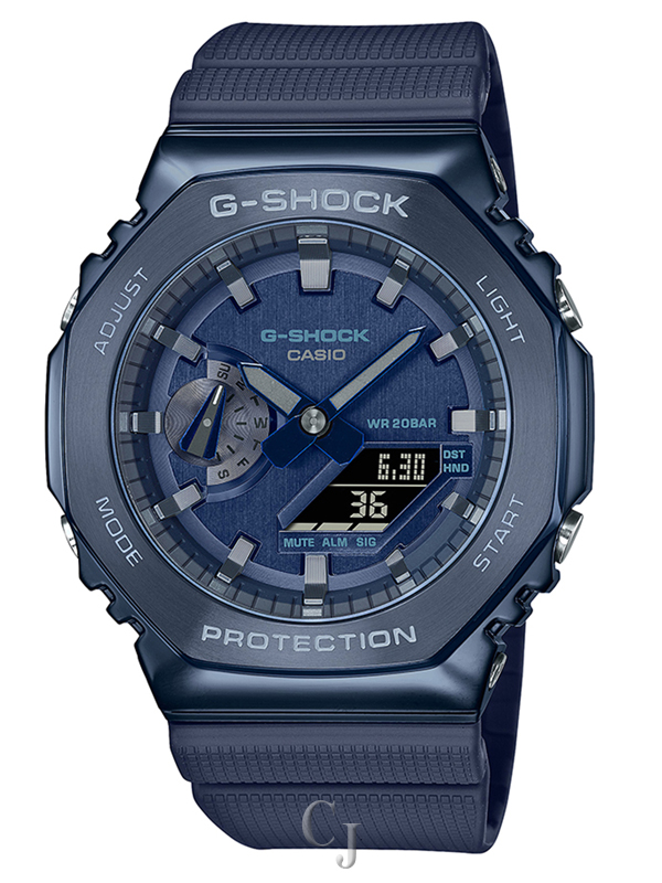 Go sleek, sharp and bold with the new blue band and dark gray IP bezel GM2100N-2A in a metal-clad octagonal take on the original iconic design.
