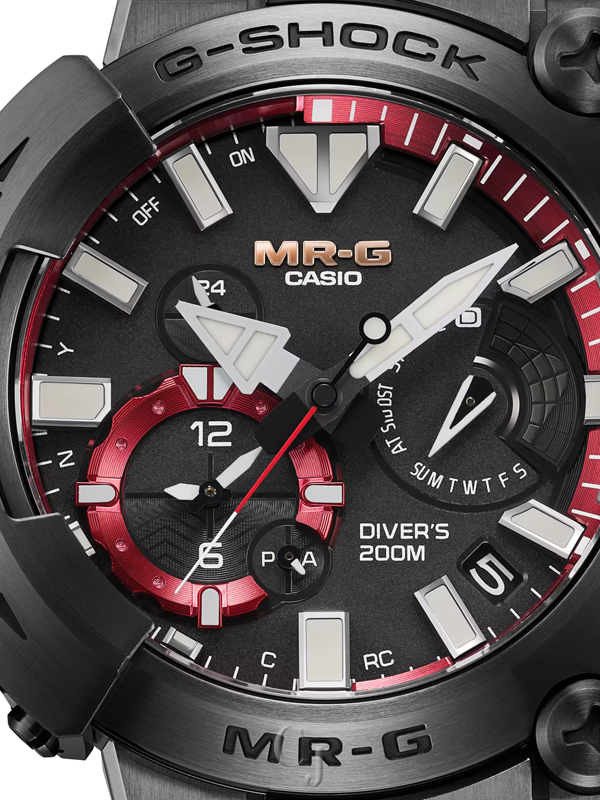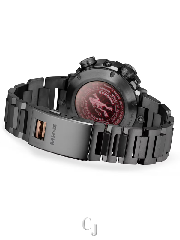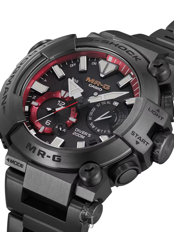 A premium, full-metal G-SHOCK MR-G timepiece for diving — the titanium armor-clad, airtight MRG-BF1000 with ISO 200-meter water resistance — joins the FROGMAN family of full-fledged diver’s watches. A G-SHOCK diving watch carries the reliability of the G-SHOCK name to the depths, providing you with peace of mind that you have the best titanium diving watch.