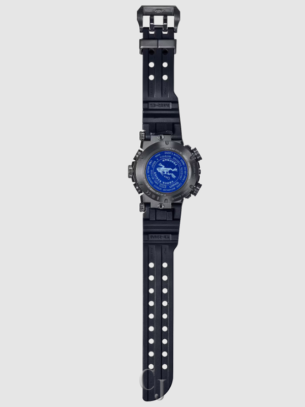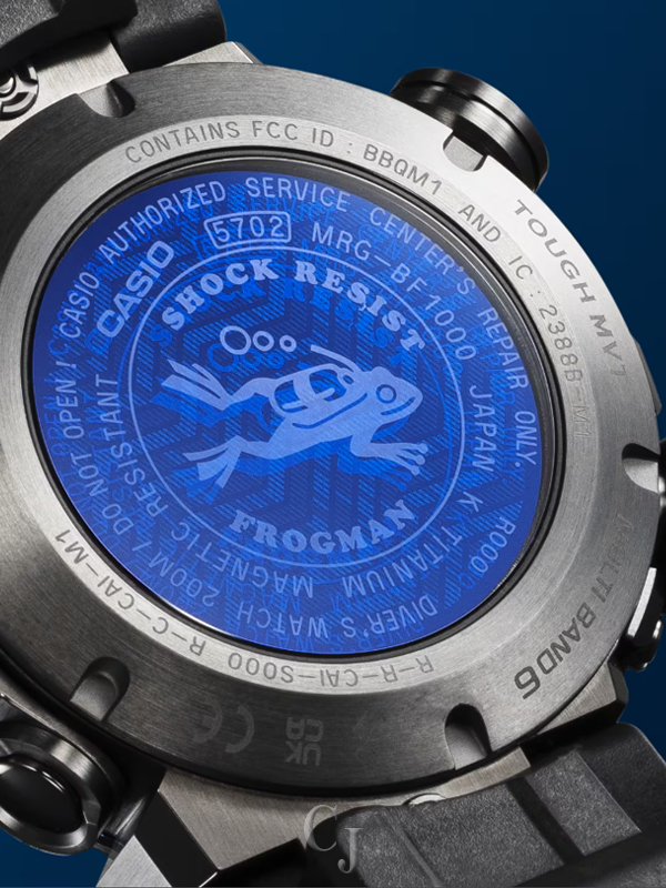 The dedicated MR-G module features a gold-plated retainer plate. The screw-lock case back is fit with sapphire crystal finished in vibrant blue vapor deposition and engraved with the iconic FROGMAN diving frog character.