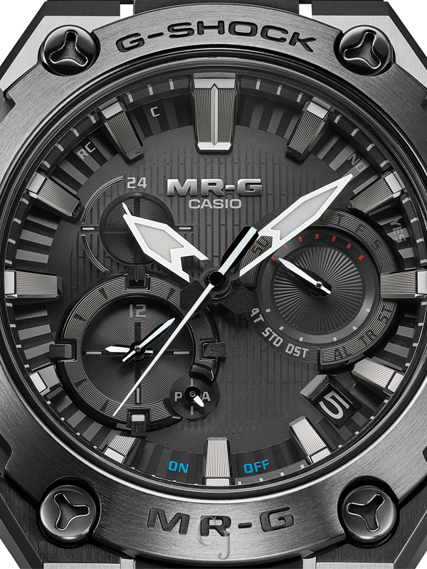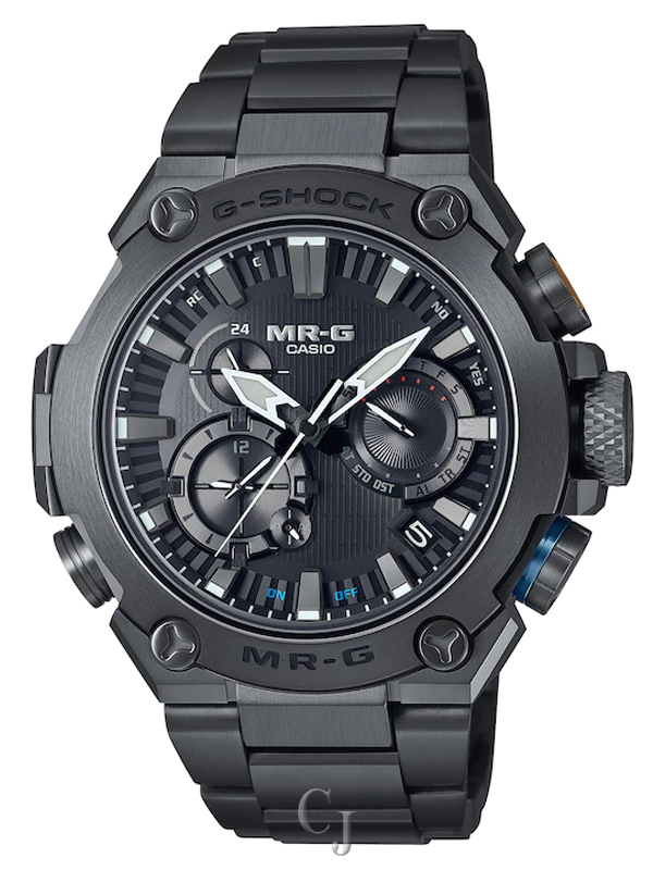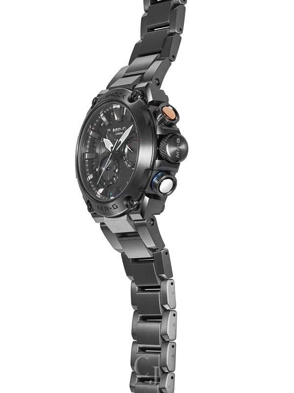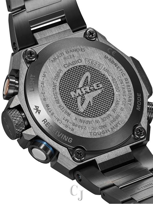 Yet function would not be outdone by style in this one-of-a-kind watch, which features radio-controlled calibration and smartphone pairing via Bluetooth® to delight even the most practical owner. The exclusive MR-G module even has a gold-plated retainer plate to reduce electrical resistance. As if this weren’t enough, Sallaz polishing, double-hardening, and a sapphire crystal with anti-reflective coating ensure that every detail of this timepiece exudes power and excellence. Step up to the MR-G, the embodiment of the strength, beauty, and precision that come to life when Japanese technology meets Japanese aesthetics. Function-wise, this model is equipped with time signal reception and Bluetooth® communication capabilities for smartphone connectivity. This MR-G model incorporates ancient Japanese strength and aesthetics, combined with unmatched modern materials, structure, and functions.