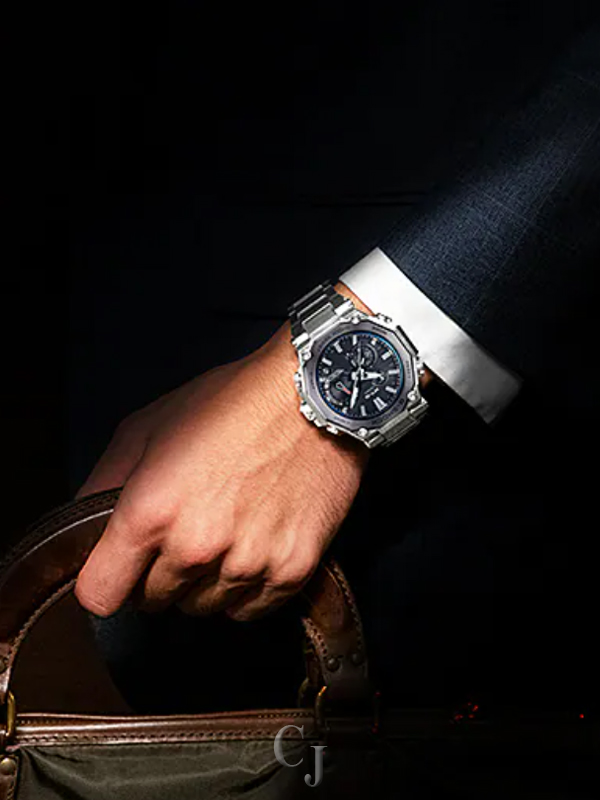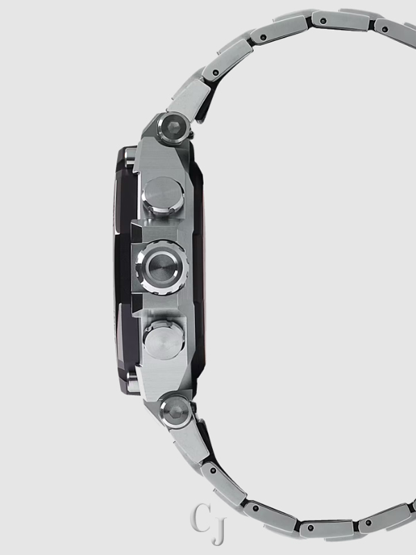 A dual core guard structure is constructed by protecting the module with an integrated carbon monocoque case and covering the outside with metal parts. The case sides are made of metal for a sophisticated design. High-impact coloring is also achieved by making the metal frame and the bezel separate. The external metal parts have a mirror finish, and the side buttons have a guard-less structure. Furthermore, the use of a highly transparent sapphire glass crystal and the delicate engraving made possible via the processing techniques of the Casio Yamagata Factory give the entire product a high-quality texture. Features a replaceable layered composite band, and weight reductions have been achieved despite improvements to the texture of the metal. Â