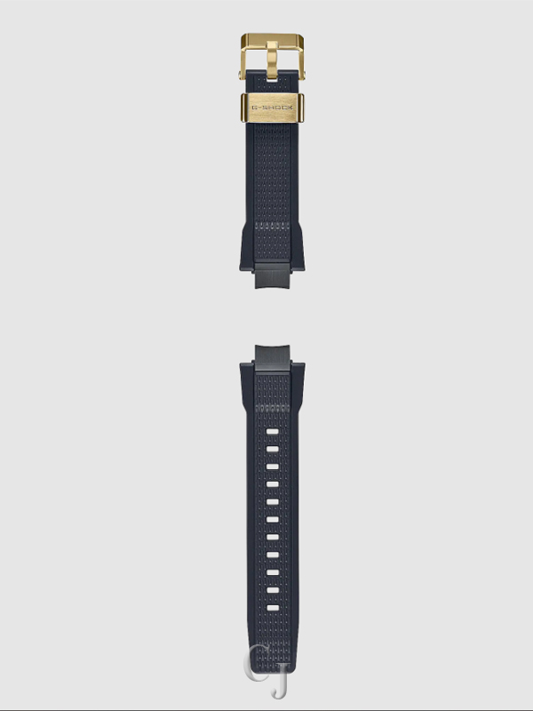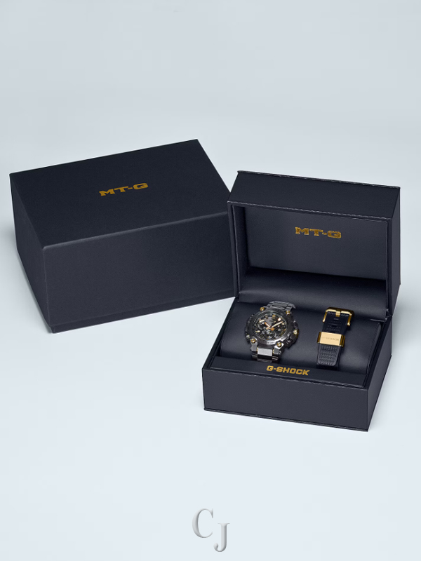 Discover a whole new level of sophisticated design. Indulge your senses with the innovative form of superior structural beauty — an MT-G timepiece that combines original G-SHOCK resin with metal for an entirely new design concept. Accented in gold hues, the MTG-B3000BDE comes with two interchangeable bands: a lighter weight, layered-composite band made of stainless steel and fine resin, and a soft urethane band with band loop and buckle ion-plated in gold. The all-new one-touch exchange structure eliminates the need for special tools. Simply press the buttons located on the sides of the lugs to quickly and easily swap out the band.Â