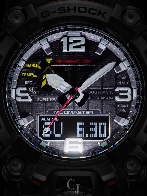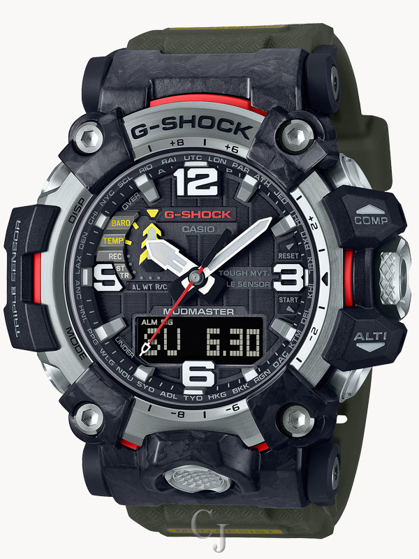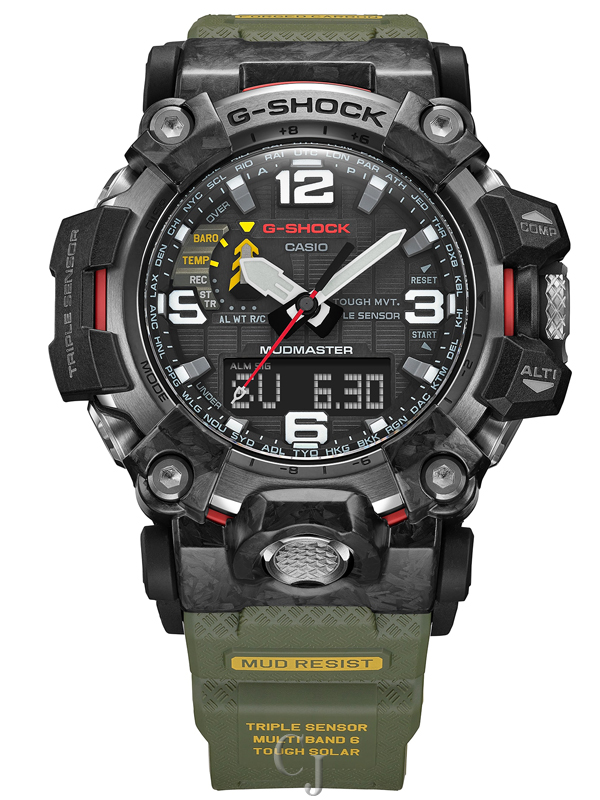 Take on the toughest terrain with the G-SHOCK MUDMASTER, designed to handle the harshest, roughest on-land environments.This shock-resistant watch is constructed to withstand all the mud and sand your adventures may bring, and it leverages our latest exterior technology to deliver a smaller profile with an even better fit. This compact design is made possible by the forged carbon bezel, carbon core guard case structure, and mud-resist buttons combined with stainless steel pipes and silicone buffers. Finely powdered carbon fiber is kneaded into resin, then heat-pressed to mold a bezel that is more complex, yet even stronger than before. Triple sensor measurements keep you updated with direction, altitude, barometric pressure, and temperature readings. Large Arabic numeral indexes, extra-thick arrow-shaped hands, double LED lights, and sapphire glass ensure high visibility. The band is textured in the style of heavy-duty no-slip rubber grips, and the buttons are knurled for easy operation. A MUDMASTER designed for practicality, durability, and power.
