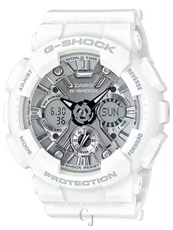 A model based on a mid-size version of the popular digital-analog combination GA-120 model. A metallic face is used with a white bezel and band to create a casual model. A trendy smaller G-SHOCK perfect for youth culture.
