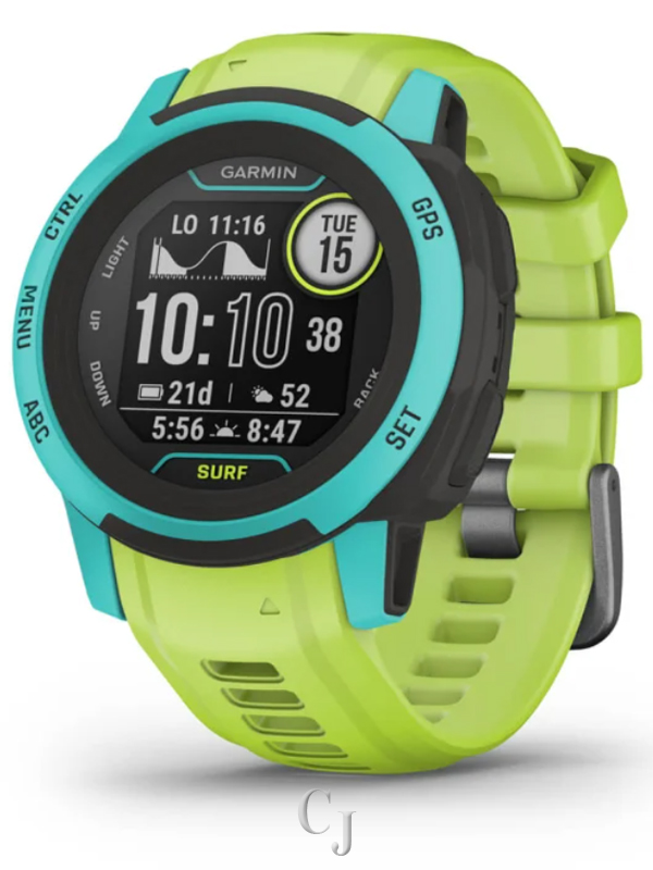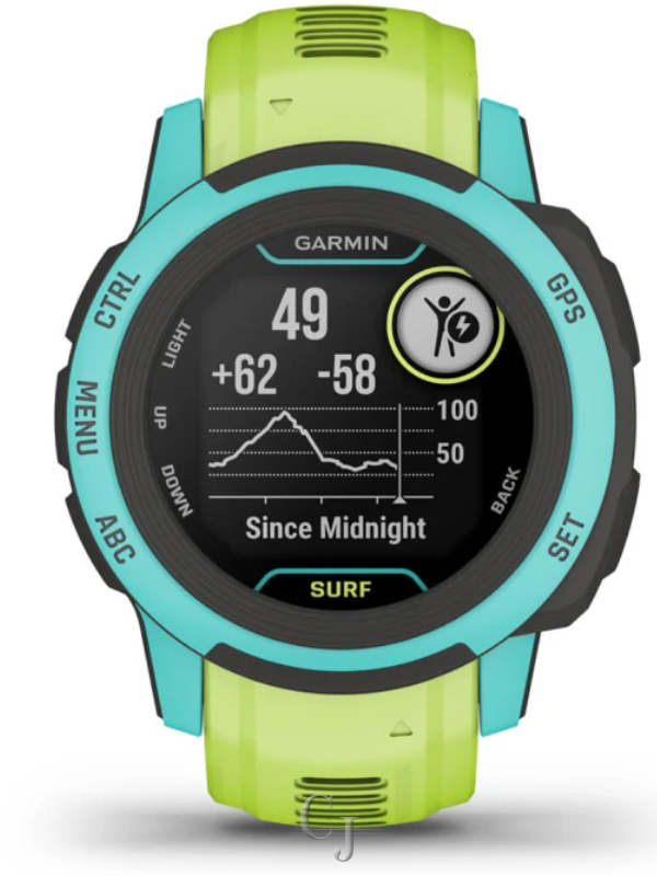 Why just ride a wave? Own it with Instinct 2S – Surf Edition. This rugged GPS smartwatch was designed to fit big features on smaller wrists. It has everything you need for fun on the water, such as tide data and surfing, windsurfing and kiteboarding activities. Do more of what you love with preloaded activity profiles for running, biking, swimming and more. When paired with a compatible device, live the ultimate connected life with smart notifications and Connect IQ compatibility. This watch even works with Surfline Sessions, which creates a video of every wave you ride in front a Surfline camera, so you can watch them later and see how you did. Understand your body better with all-day health monitoring for energy levels, stress, sleep, Pulse Ox and much more.
