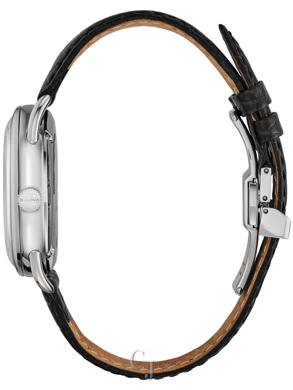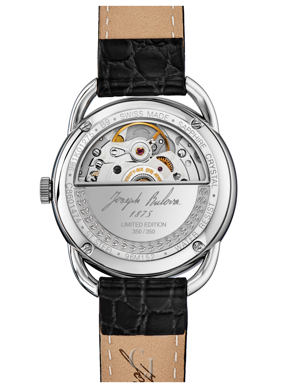 The Joseph Bulova Collection pays homage to the brand’s visionary founder. Stainless steel case with a white dial and applied markers. Open case back showcasing the fine Swiss made 26-jewel automatic movement, featuring the Joseph Bulova signature, “1875” and “Swiss Made”, and a custom-designed rotor. Black leather alligator grain strap with the “Joseph Bulova” signature on the interior lining and a deployant closure with pushers. Box sapphire crystal with anti-reflective coating. 38-hour power reserve. Limited to 350 pieces.