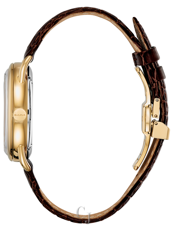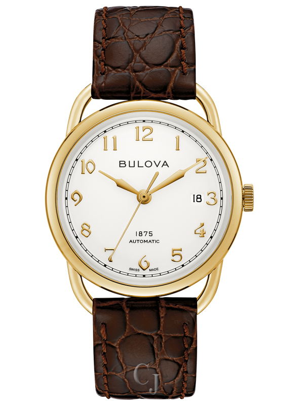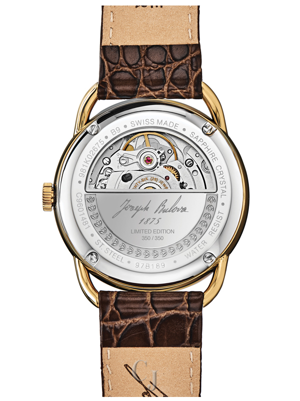 The Joseph Bulova Collection pays homage to the brand’s visionary founder. Gold-tone stainless steel case with an ivory dial and applied markers. Open case back showcasing the fine Swiss made 26-jewel automatic movement, featuring the Joseph Bulova signature, “1875” and “Swiss Made”, and a custom-designed rotor. Brown leather alligator grain strap with the “Joseph Bulova” signature on the interior lining and a deployant closure with pushers. Box sapphire crystal with anti-reflective coating. 38-hour power reserve. Limited to 350 pieces. Diameter: 38mm Thickness: 11.35mm $1,350