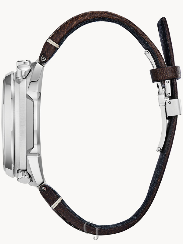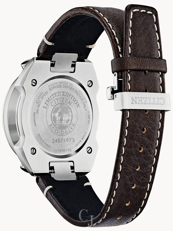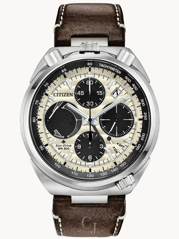 Paying homage to a retro 1973 CITIZEN Bullhead model, the newly modernized CITIZEN Limited Edition Tsuno Chrono Racer showcases a unique case styling, trendy color combinations and is sure to stand out on your wrist. A hand assemled movement, the Tsuno Chrono Racer features 1/5-second chrono, alarm, tachymeter, instantaneous flyback, power reserve and date. Seen here in a stainless steel case, dark brown leather strap with white constrast stitching and parchment and black dial. Featuring our Eco-Drive technology – powered by light, any light. Never needs a battery. Caliber number E210.