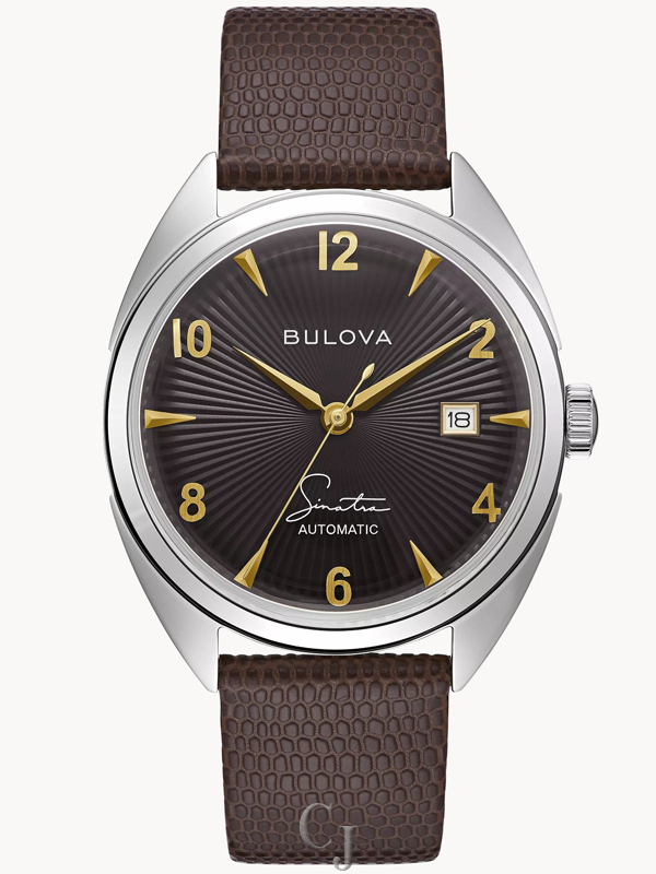 Incorporating vintage Bulova designs with the unmistakable elements of legendary performer, Frank Sinatra, the ‘Fly Me To The Moon’ watch features a stainless steel case with gold-tone vintage style hands and markers. Frank Sinatra’s signature is displayed elegantly on the textured black dial. The watch features a Miyota Caliber 8215 21-jewel automatic movement with a 42-hour power reserve and calendar. The exhibition case back showcases the fine movement and features the song title as well as the iconic Fedora Hat, which can also be found etched on the crown. The brown lizard grain textured leather strap features a deployant buckle and is stamped with the name ‘Fly Me To The Moon’ along the inside. The watch features a domed sapphire crystal with AR coating and water resistance to 30 meters.