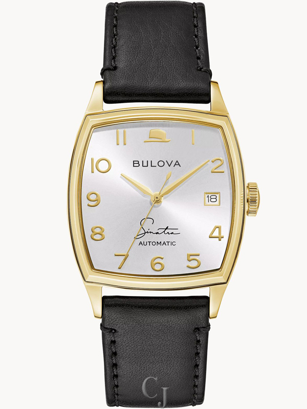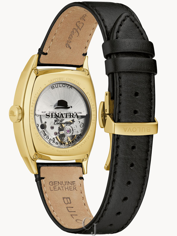 Incorporating vintage Bulova designs with the unmistakable elements of legendary performer, Frank Sinatra, the ‘Young At Heart’ watch features a tonneau shaped gold-tone stainless steel case with gold-tone hands and markers. Frank Sinatra’s signature and iconic Fedora Hat are elegantly displayed on the silver white sunray dial. The watch features a Miyota Caliber 8215 21-jewel automatic movement with a 42-hour power reserve and calendar. The exhibition case back showcases the fine movement and features the song title as well as the iconic Fedora Hat, which can also be found etched on the crown. The padded black leather strap features a deployant buckle and is stamped with ‘Young At Heart’ along the inside. The watch features a domed sapphire crystal with AR coating and water resistance to 30 meters.