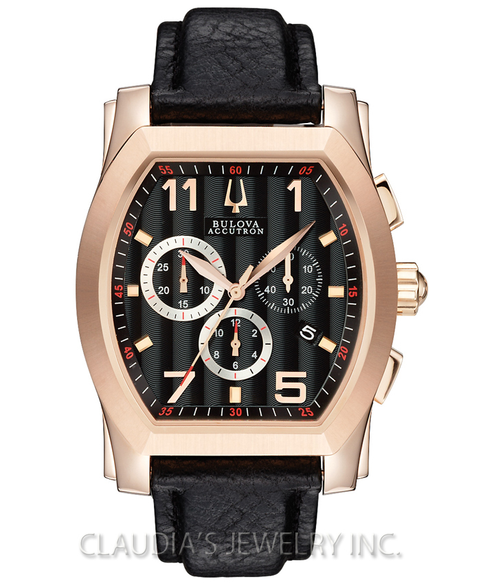 Bulova Watch Accutron Stratford Chronograph 64B114. The authentic story continues with classic confident designs. Since 1875, Bulova has been renowned for artistry and innovation, and aimed for superb craftsmanship and advanced technology. Blending chronograph precision and tailored lines, this classic Swiss-made design from the Bulova Accutron Stratford Collection, with curved tonneau-shaped case and anti-reflective sapphire crystal, is crafted in stainless steel with rose-gold ion-plated finish, black Cotes de Genève patterned dial, calendar, four-screw caseback, black leather strap, double-pusher deployment buckle and water resistance to 50 meters.