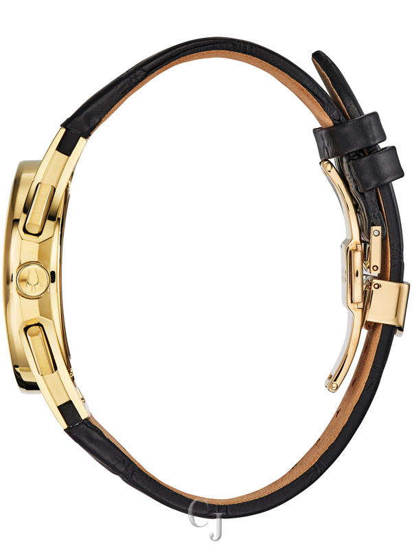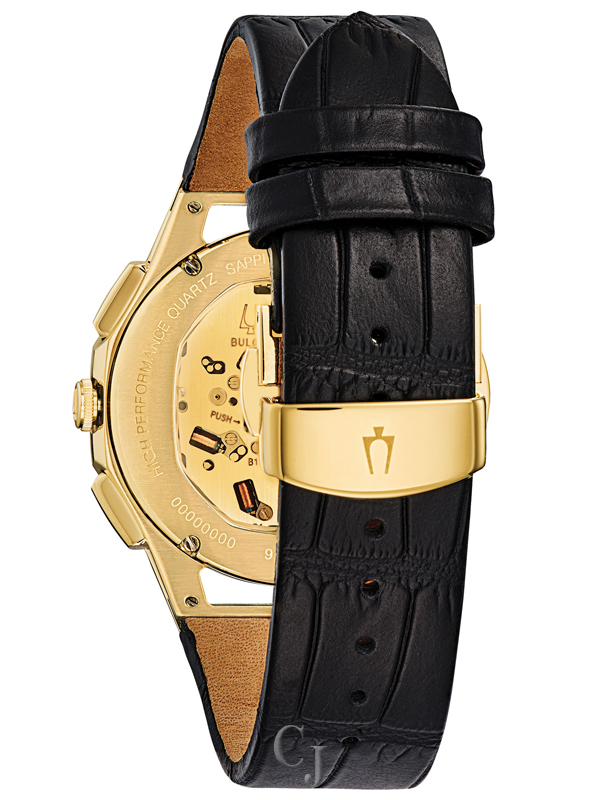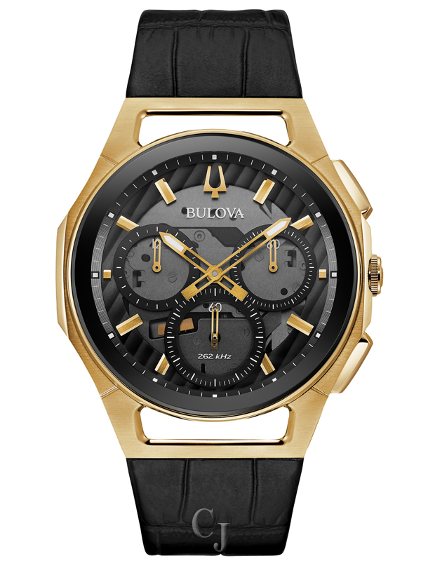 Yellow gold-tone stainless steel case with a black leather strap. Fixed yellow gold-tone bezel with a black ring. Black (transparent center) dial with luminous yellow gold-tone hands and index hour markers. Minute markers around the outer rim. Dial Type: Analog. Luminescent hands and markers. Chronograph – three sub-dials displaying: 60 second, 60 minute and 12 hour. Quartz movement. Scratch resistant sapphire crystal. Transparent case back. Round case shape. Case size: 44 mm. Fold over clasp. Water resistant at 30 meters / 100 feet. Functions: chronograph, hour, minute, second. Additional Info: high-performance quartz technology with 262 khz vibrational frequency for precise accuracy. Casual watch style. Bulova CURV Chronograph Quartz Black Transparent Center Dial Men’s Watch 97A143