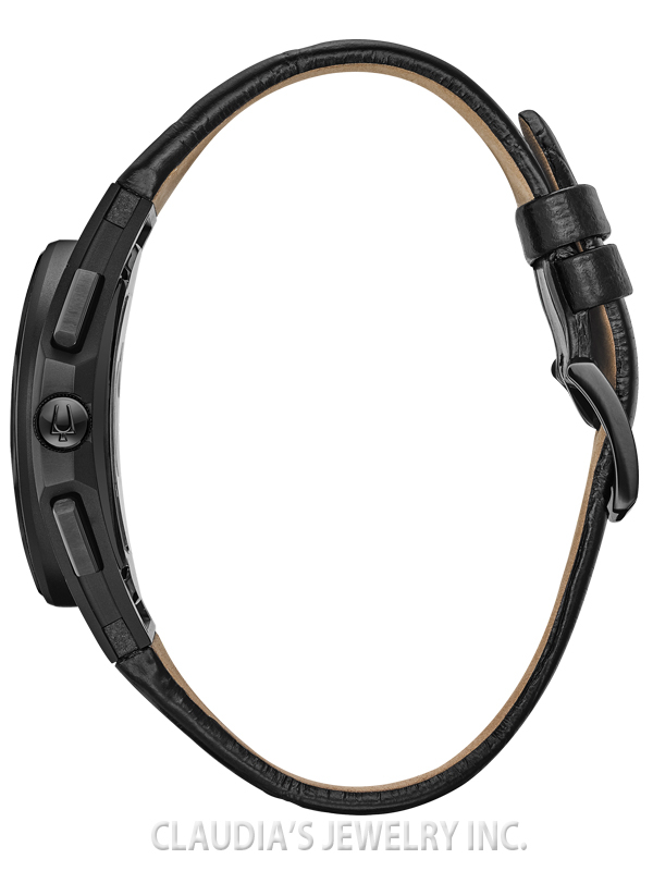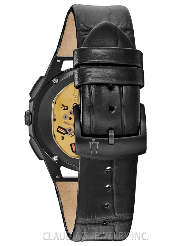 Curved case, dial and Bulova’s proprietary/world’s first curved chronograph movement featuring high-performance quartz technology with 262 kHz vibrational frequency for exceptional accuracy. Black IP titanium screw-back case with open work detail, black five-hand chronograph dial with 8 full cut diamonds, curved sapphire crystal with antireflective coating, and black genuine alligator strap with push-button deployant buckle.