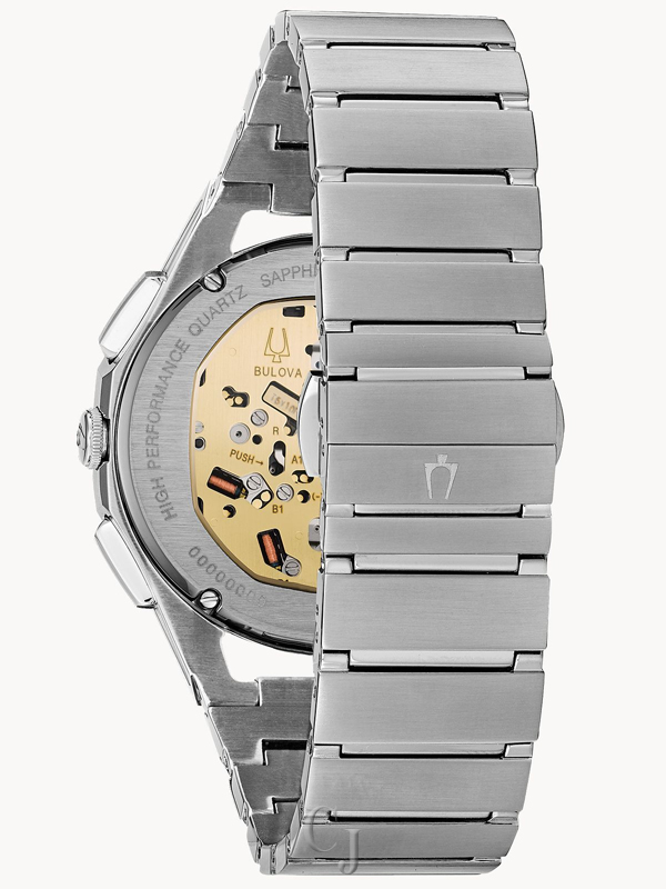 From the CURV Collection. The worlds first curved chronograph movement features high-performance quartz technology with 262 kHz vibrational frequency for precise accuracy. Five-hand chronograph in stainless steel with dark blue dial with silver-tone hands and markers, exhibition case back, anti-reflective curved sapphire glass, screw-back case, stainless steel bracelet with double-press deployment closure, and water resistance to 30 meters.