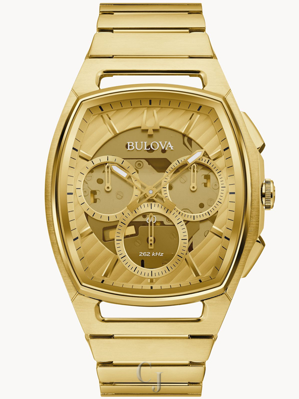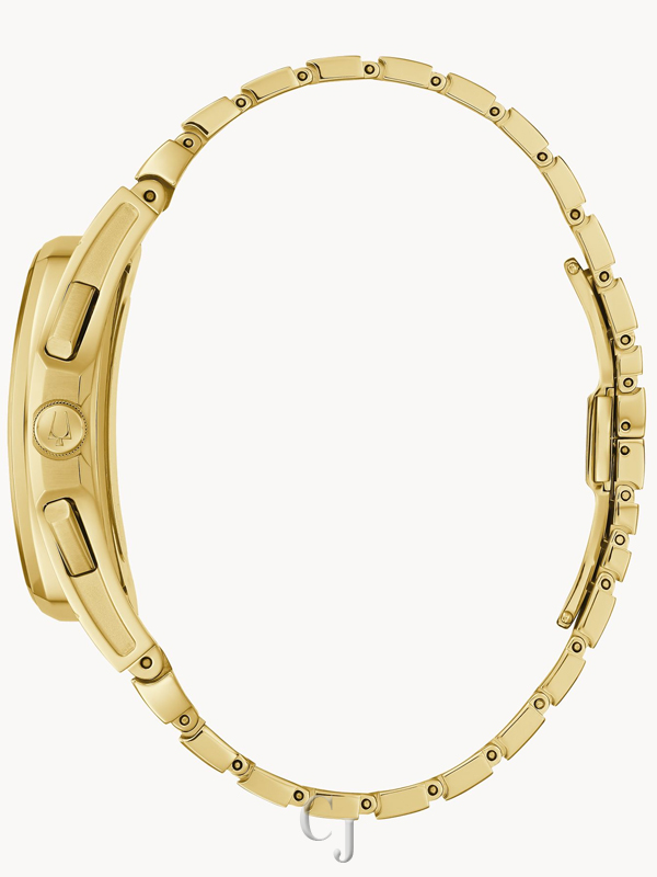 The breakthrough excitement of the world’s first curved chronograph movement continues, as Bulova once again reimagines what a watch should be. In 2020, a new Curved Tonneau case underscores the flowing lines of the CURV collection – while offering a distinct new aesthetic – once again, making a design statement backed by technology innovation. It features a gold-tone stainless steel tonneau-shaped case and champagne dial finished with a curved sapphire crystal and an anti-reflective coating. It is paired with a gold-tone stainless steel bracelet and deployant push button closure for a seamless design. This luxury men’s watch will feel as innovative and unique in the future as it does today, a perfect accessory for any occasion.