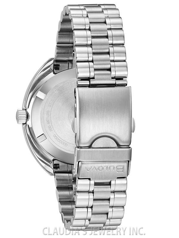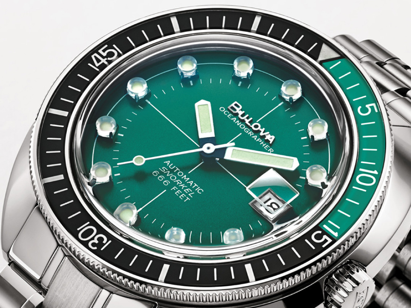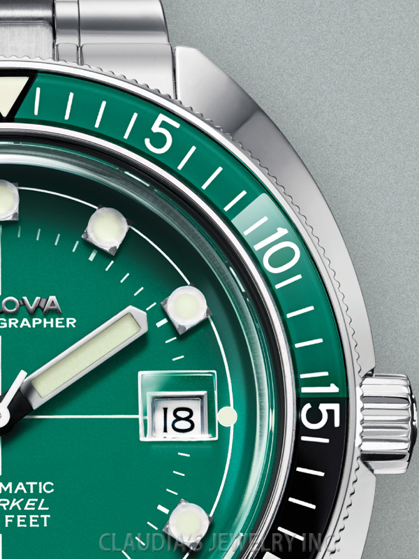 Devil Diver A design tribute to Bulova’s acclaimed ‘70’s Oceanographer “Devil Diver” watch powered by a self-winding mechanical movement with a 42-hour power reserve. Stainless steel screw-back case with screw-down crown, green three-hand dial with luminescent markers and date feature, box sapphire crystal with blue anti-reflective coating, stainless steel bracelet with double-press fold-over buckle closure, safety bar and extender, and water resistance to 200 meters/666 feet. ISO certified.