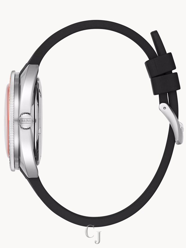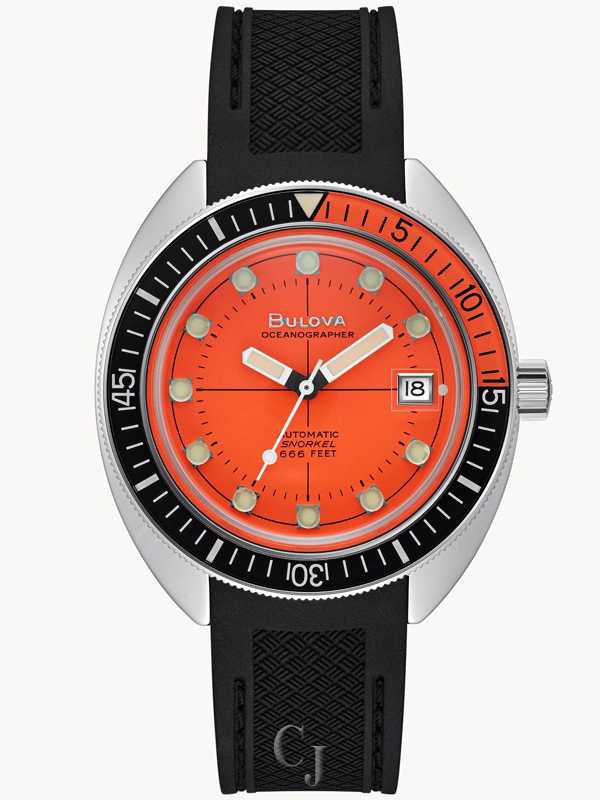 Bulova’s eye-catching Oceanographer men’s timepiece is a perfect blend of function and sport style. It features a stainless steel case and bright orange dial with a black supple rubber strap and fine Miyota automatic movement. It also has a rotating bezel in black and orange, and a calendar function, as well as being ISO certified, with water resistance up to 200 meters with a screw-down crown. It is topped with a domed sapphire crystal for the perfect finish. This is a modern take on a classic dive timepiece, and is sure to make a statement.