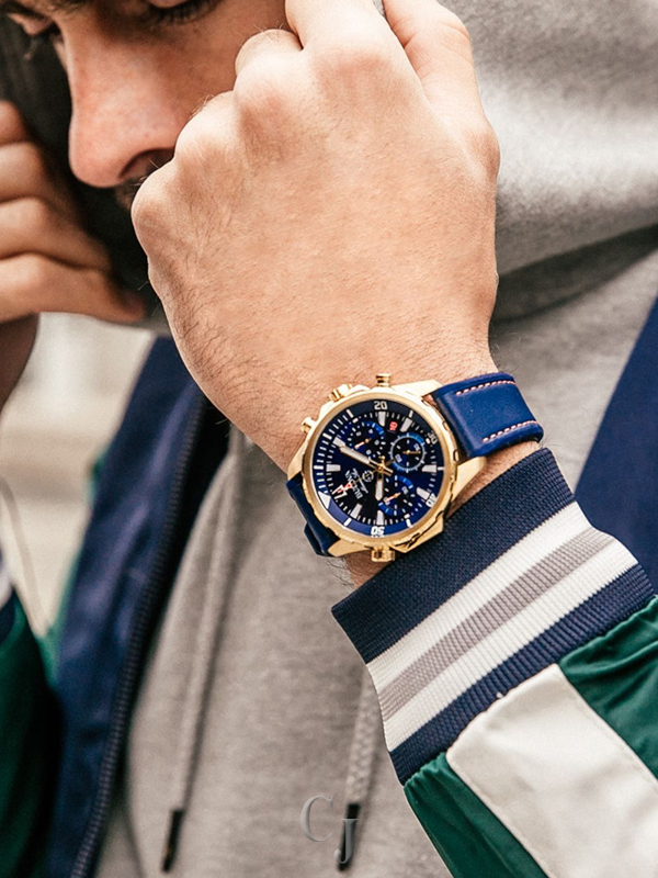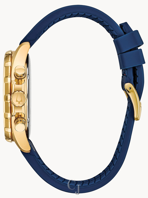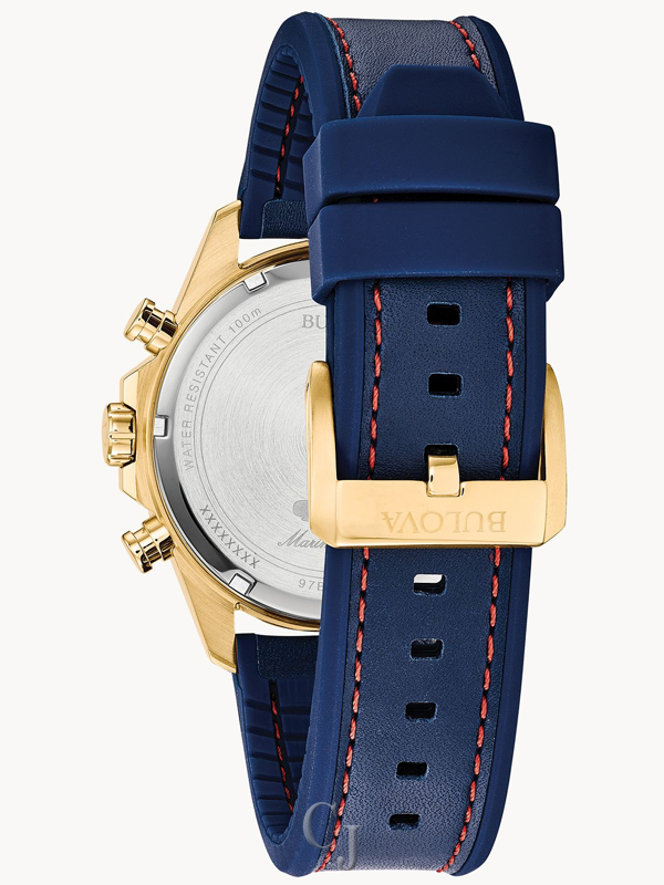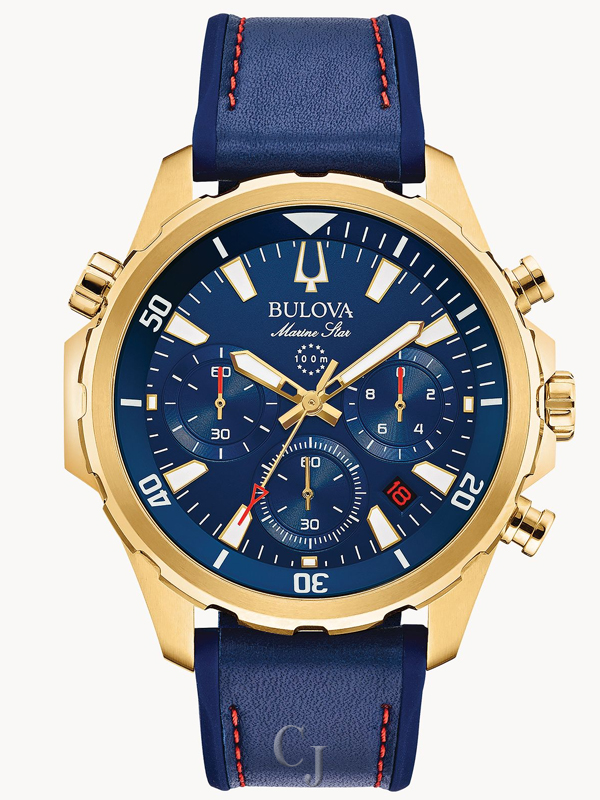 From the Marine Star Collection. Six-hand chronograph function with calendar, gold-tone stainless steel case with rotating dial ring to measure elapsed time, blue dial with gold-tone accents, flat mineral glass, screw-back case, blue leather and silicone strap with red stitch detail and three-piece buckle closure, and water resistance to 100 meters.